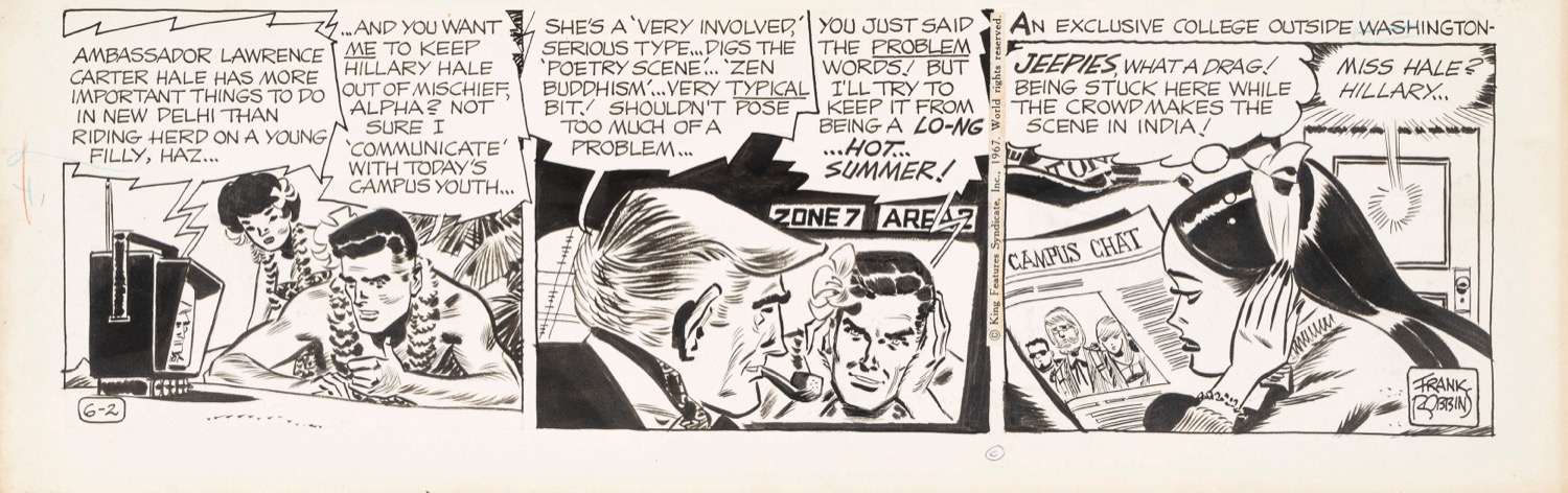 Striscia giornaliera del 02/06/1967 per "Johnny Hazard". Creata dal genio di Robbins e apparsa per la prima volta sui quotidiani statunitensi il 5 giugno 1944, il giorno prima dello sbarco in Normandia, Johnny Hazard vede protagonista un pilota americano. Con la fine della guerra ormai imminente, le storie di questo eroe tutto d'un pezzo si focalizzano sulla nuova "minaccia rossa". Robbins riesce con abilità a caratterizzare nel dettaglio ogni personaggio e grazie al suo talentuoso tratto, che risente fortemente dell'influsso caniffiano, ci fa apprezzare ogni singola striscia. Firmata e datata.