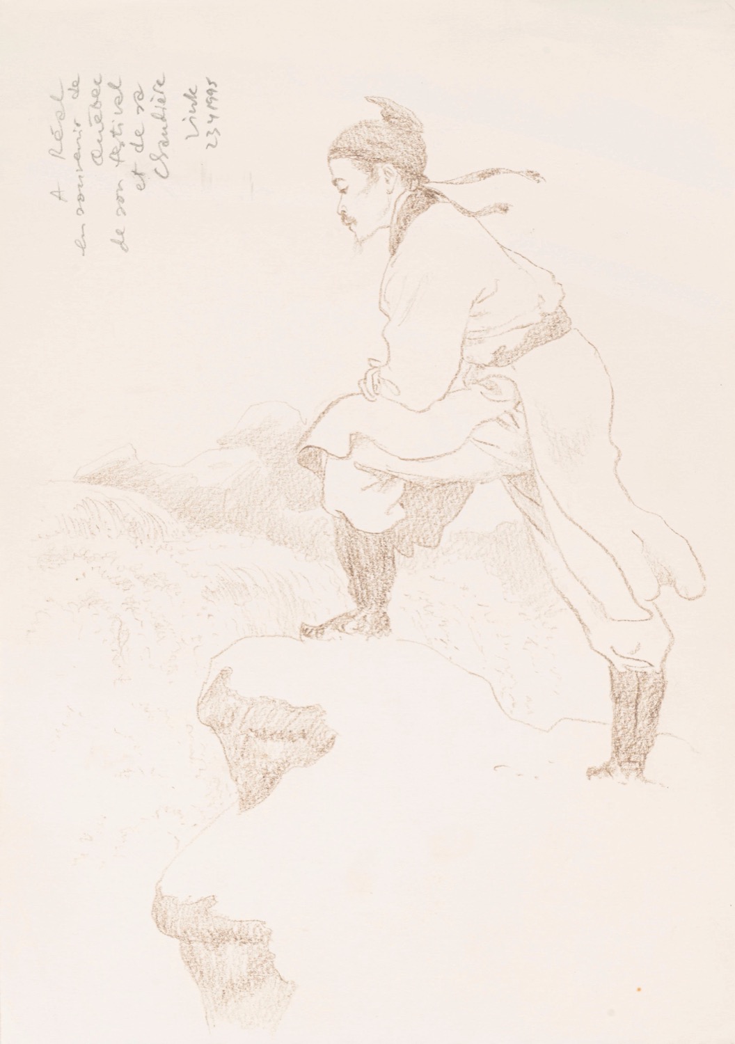 Disegno originale realizzato dall'autore vietnamita Vink, raffigurante il protagonista della celebre serie "Le moine fou" edita per la prima volta in Francia da Dargaud nel 1984. Firmato e datato.