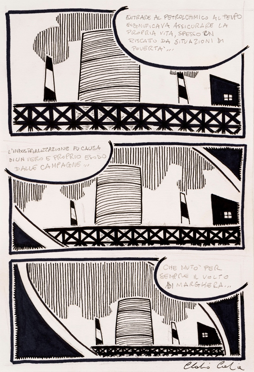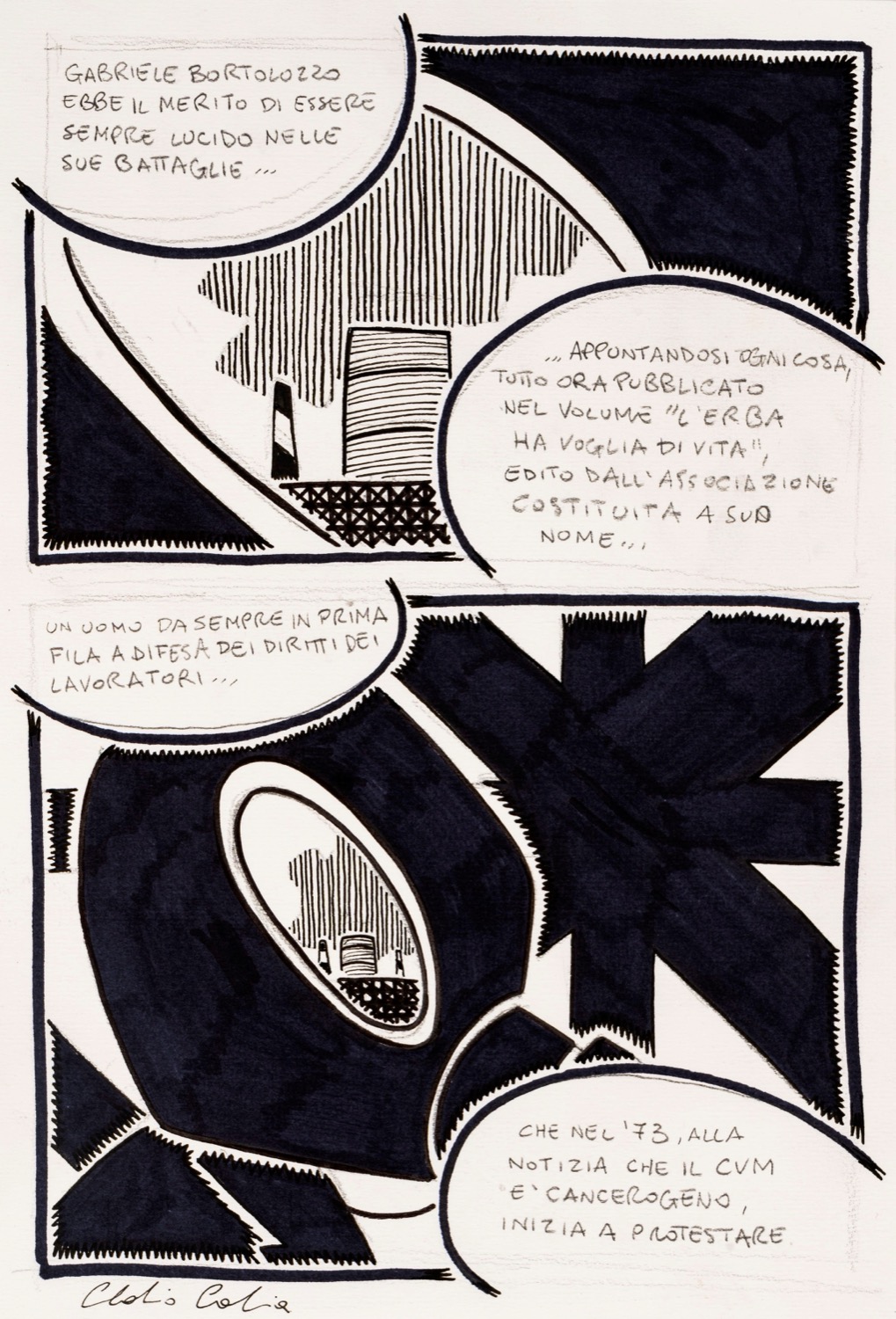 Coppia di 2 tavole originali realizzate da Calia per la graphic novel "Porto Marghera - La legge non è uguale per tutti", edita da BeccoGiallo nel 2007. Entrambe firmate.