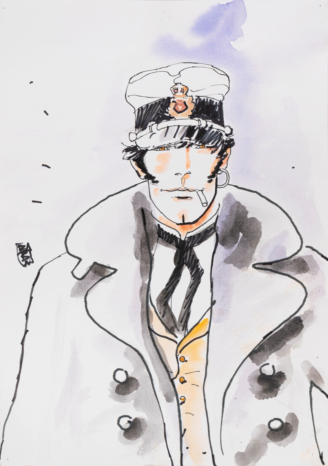 Illustrazione originale realizzata da Babini come omaggio al Corto Maltese di Hugo Pratt. Fori di affissione agli angoli e lieve piega all'angolo inferiore destro. Firmata.