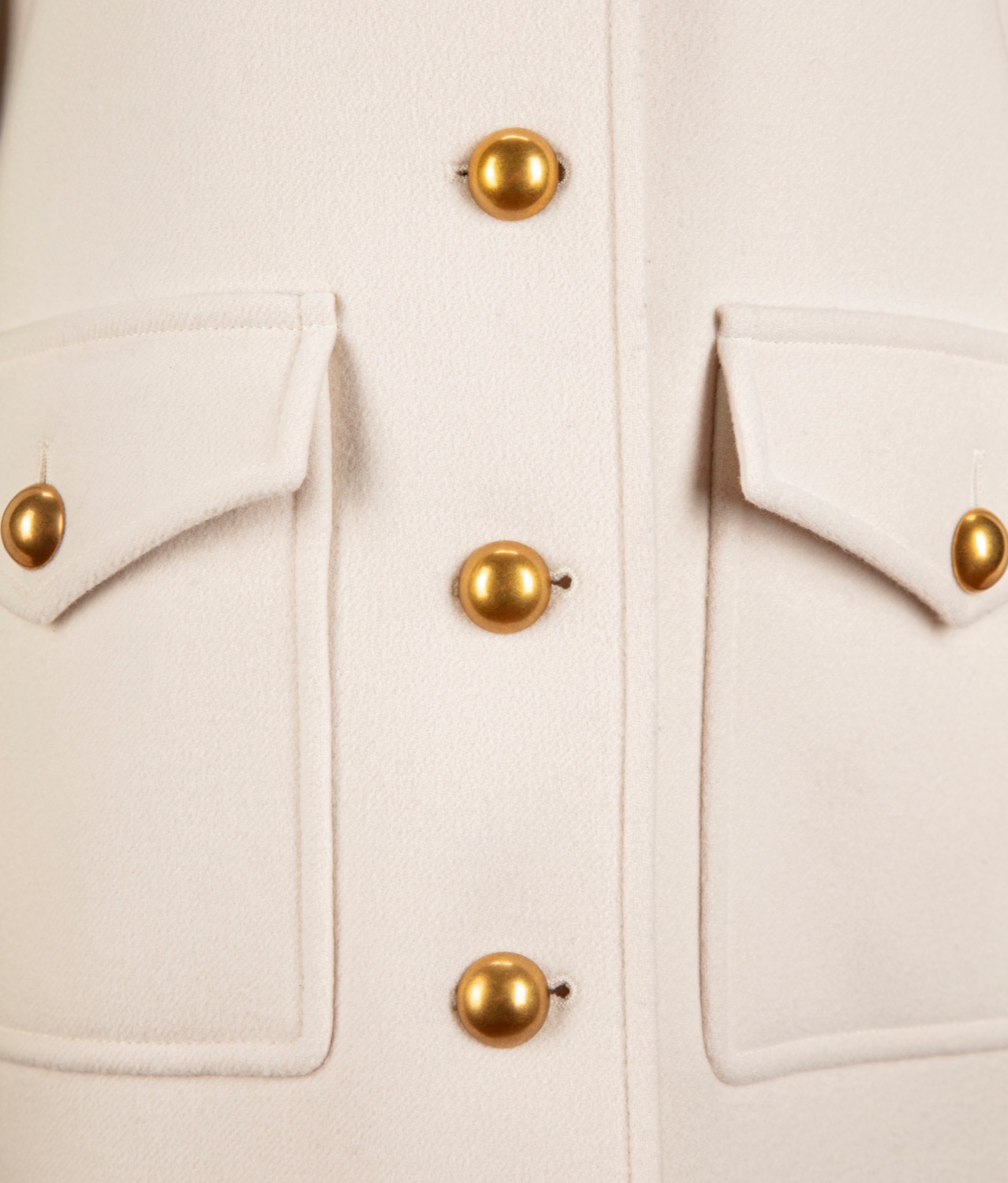 in lana color panna, bottoni bombati in metallo brunito, martingala con fibbia logata, con custodia, taglia 36in lana color panna, bottoni bombati in metallo brunito, martingala con fibbia logata, con custodia, taglia 36