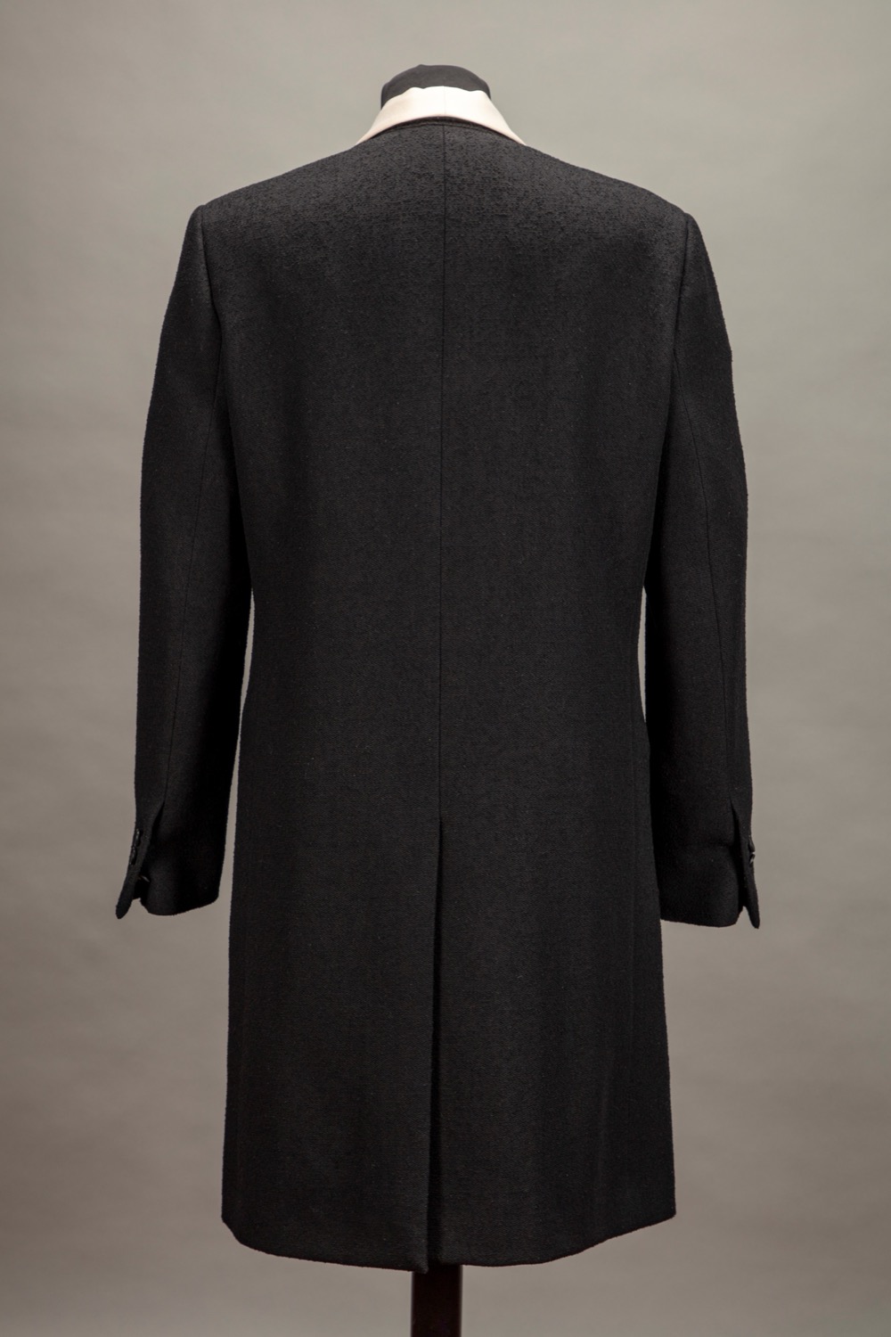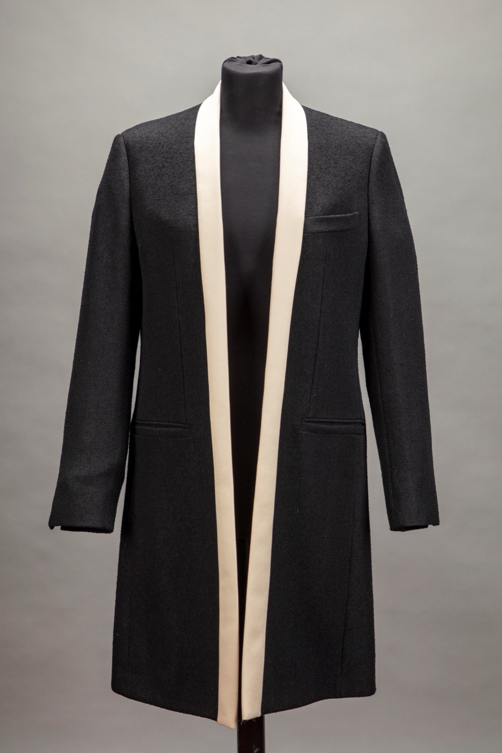 in lana color nero, profili in raso color crema, fodera in seta, bottoni logati, taglia 34 francese, con custodiain lana color nero, profili in raso color crema, fodera in seta, bottoni logati, taglia 34 francese, con custodia