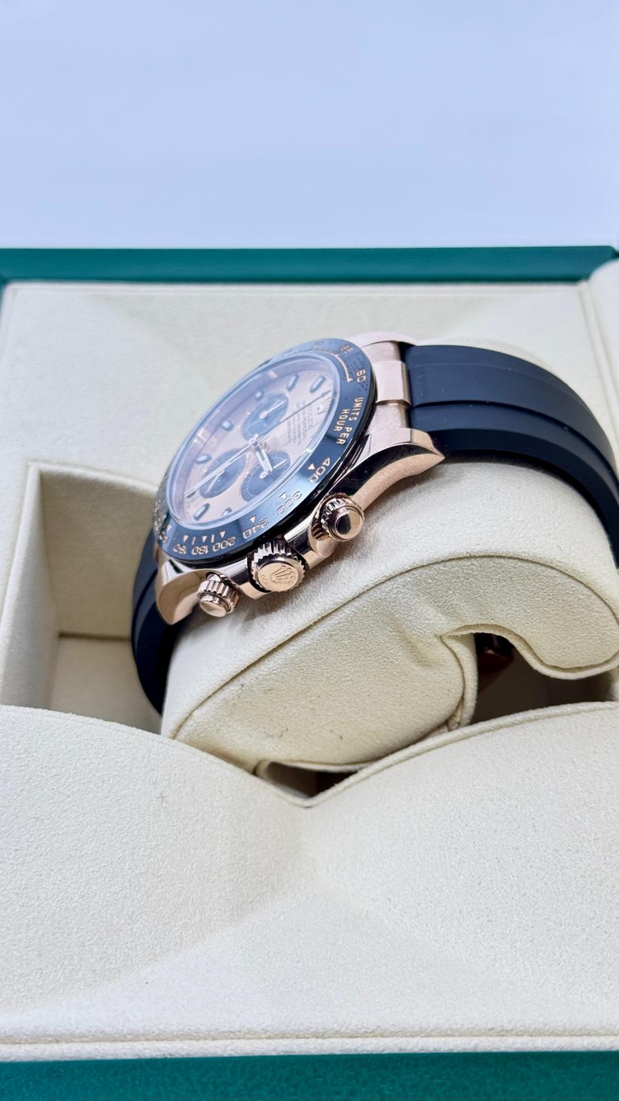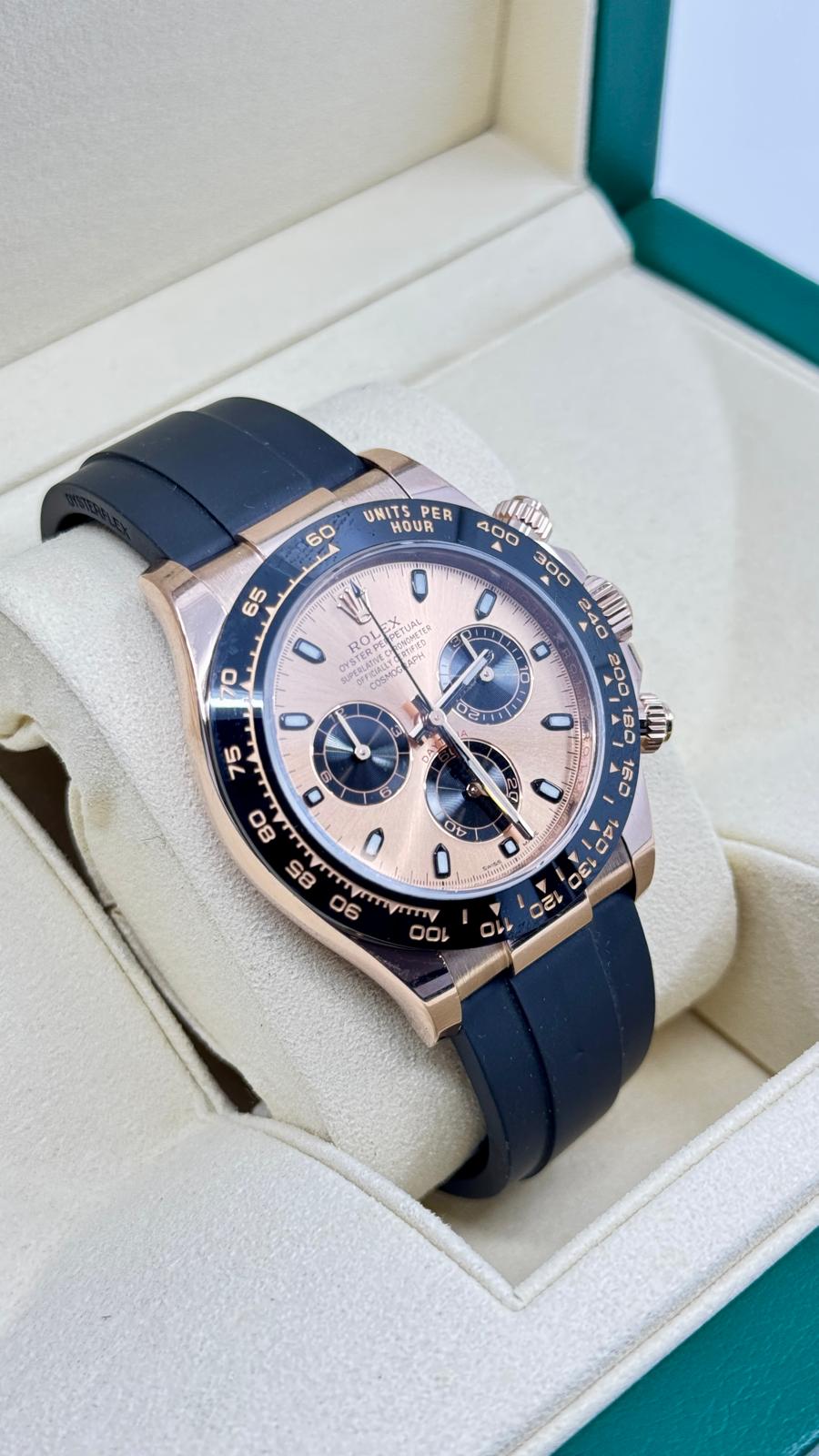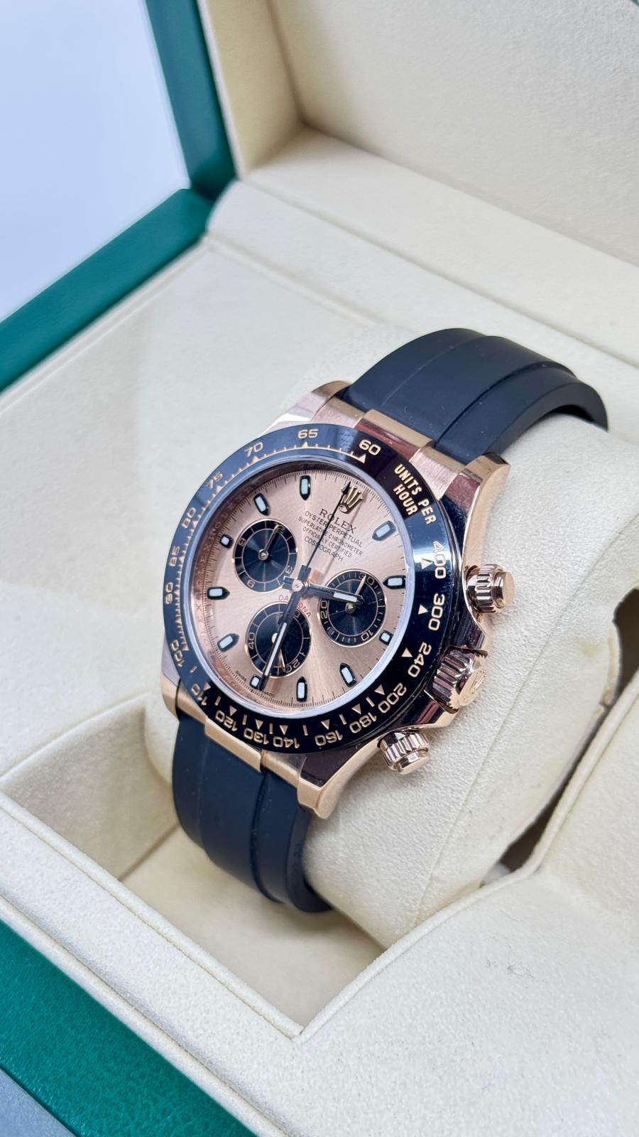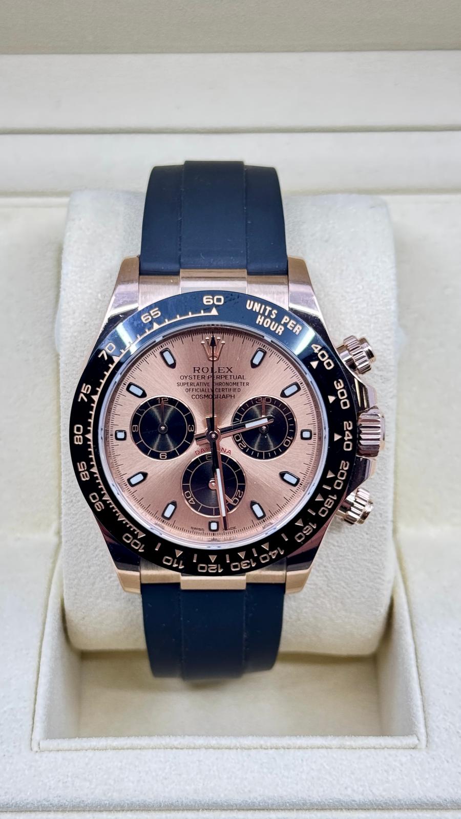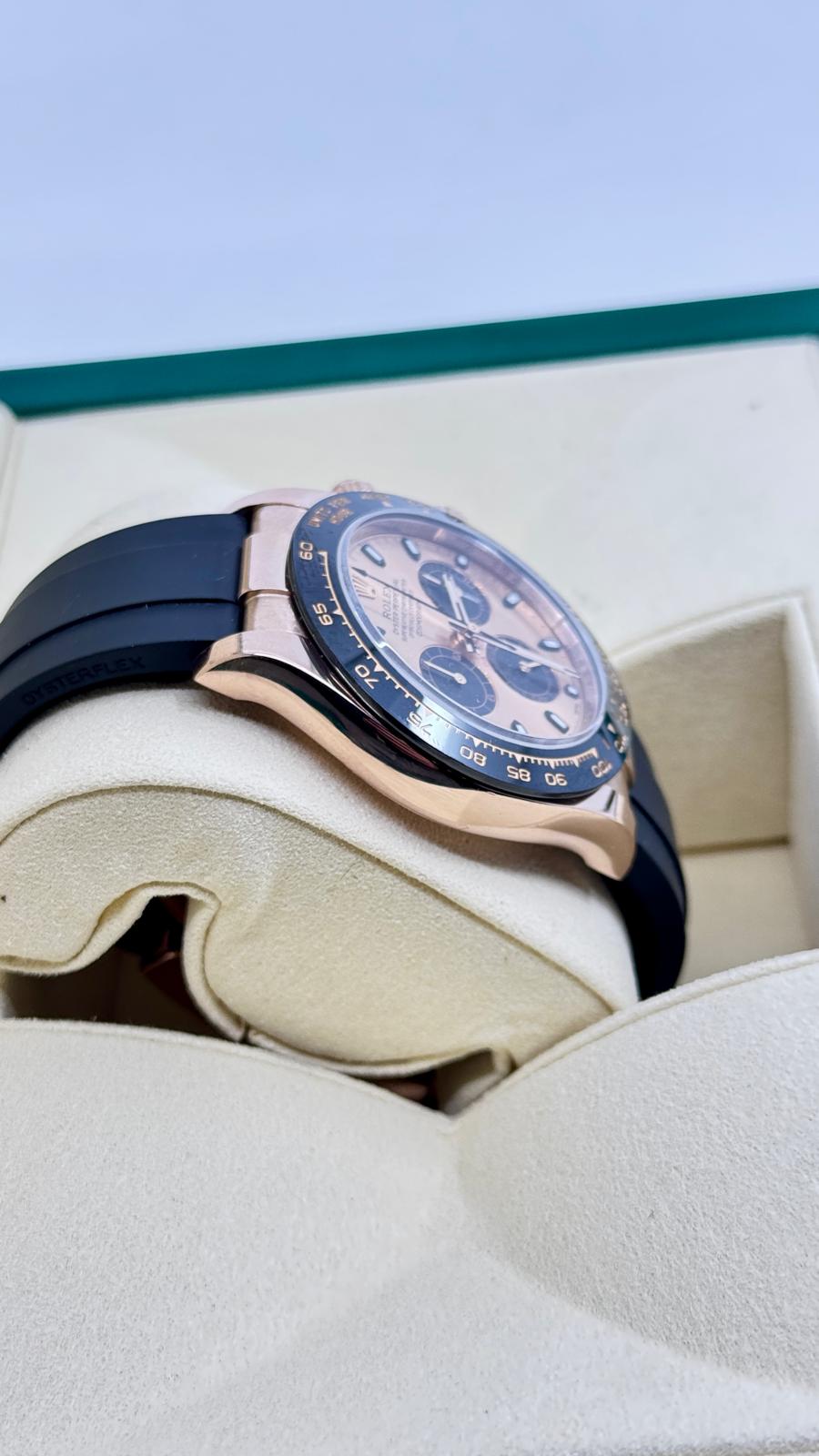 Marca Rolex Modello (Orologio) Daytona Numero di referenza 116515ln (Everose) Carica Automatico Materiale della cassa Oro rosa Materiale cinturino oysterflex Anno di produzione 2019 (Anno approssimativo) Corredo documenti originali, no box Calibro Carica Automatico Materiale della cassa Oro rosa Diametro 40 mm Impermeabile 10 ATM Materiale lunetta Ceramica Vetro Vetro zaffiro Quadrante Rosa fucsia Numeri sul quadrante Senza numeri Colore cinturino Nero Chiusura Déployante Materiale chiusura Oro rosa Funzioni Cronografo