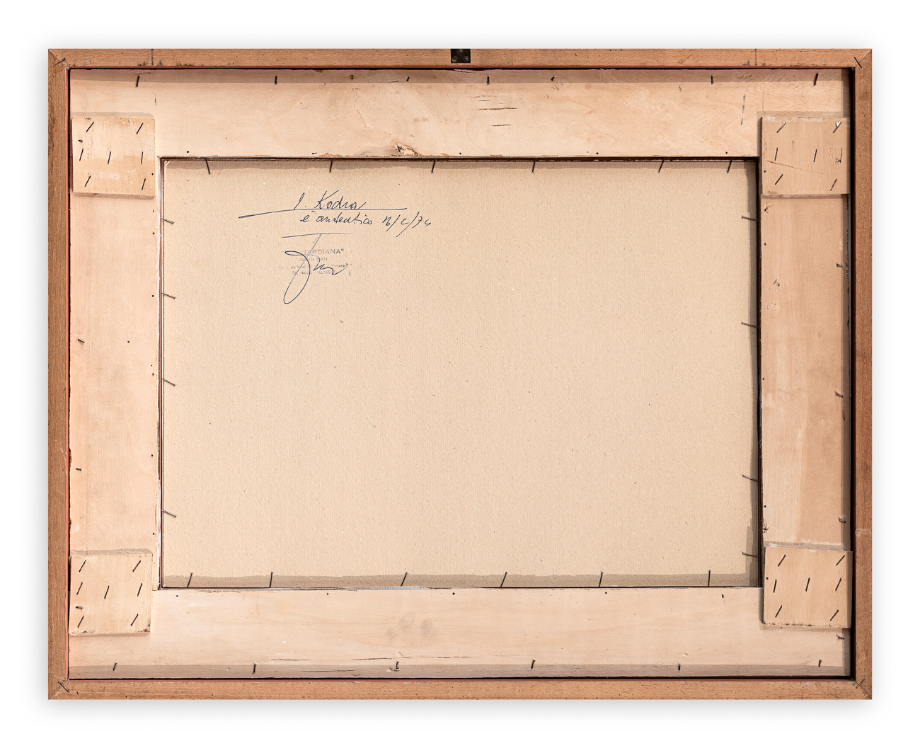 Dichiarazione di autenticità dell'Artista rilasciata in data 16/02/1974 dietro e timbro della Galleria d'Arte Leonardiana (Alassio) al retro del cartone protettivo