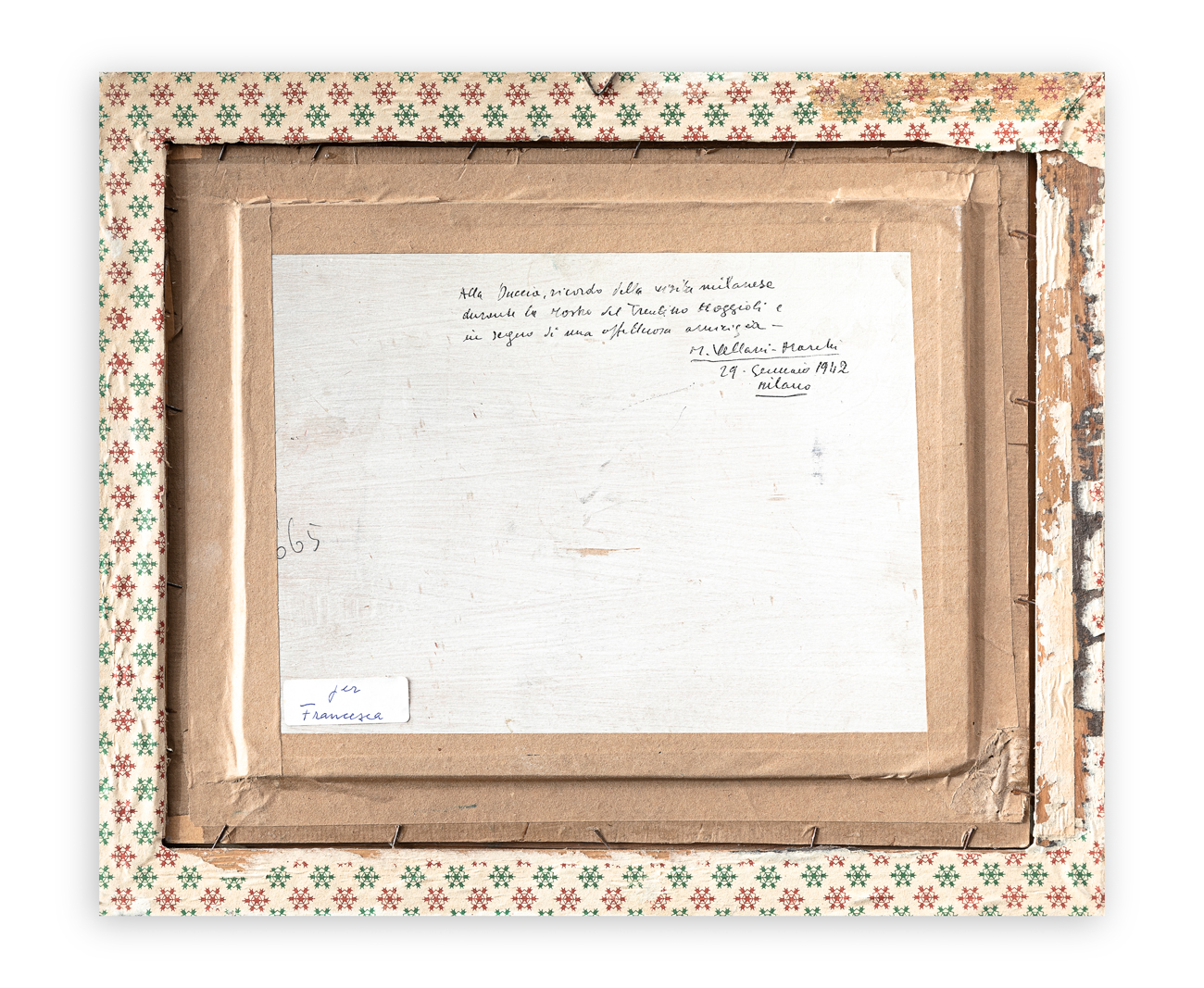 Firma e dedica ad personam 'Alla Duccia, ricordo della visita milanese durante la mostra del Trentino Moggioli e in segno di una affettuosa amicizia' datata 'Milano - 29 Gennaio 1942' al retro