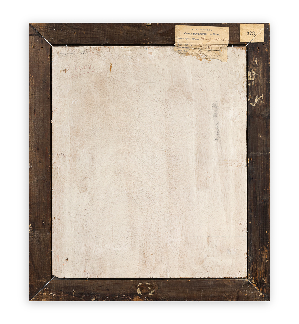 Etichetta 'Opera Bevilacqua La Masa - Città di Venezia' con caratteristiche tecniche dell'opera al retro