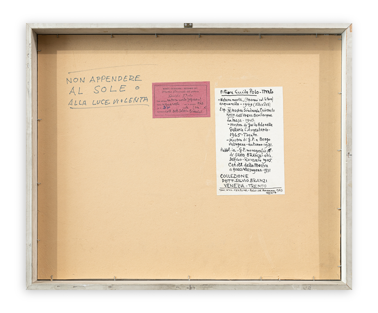 Cartiglio dell'esposizione 'Mostra personale del pittore Guido Polo - Borgo Valsugana - Settembre 1971' al retro del cartone protettivo