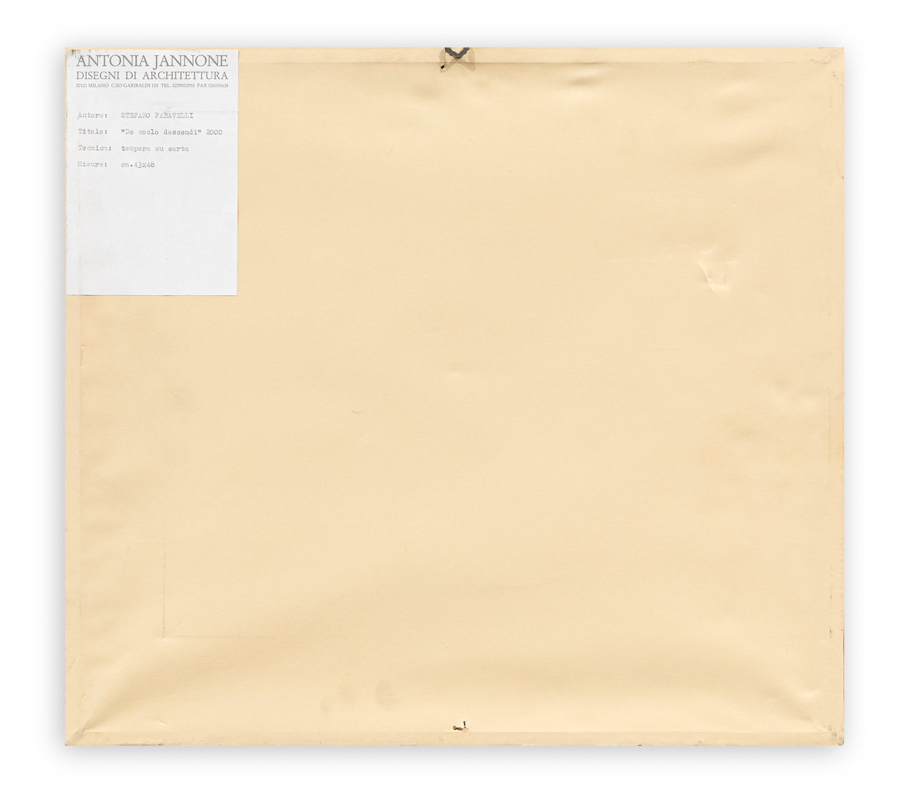 Etichetta della Galleria Antonia Jannone disegni di architettura (MI) al retro del cartoncino protettivo