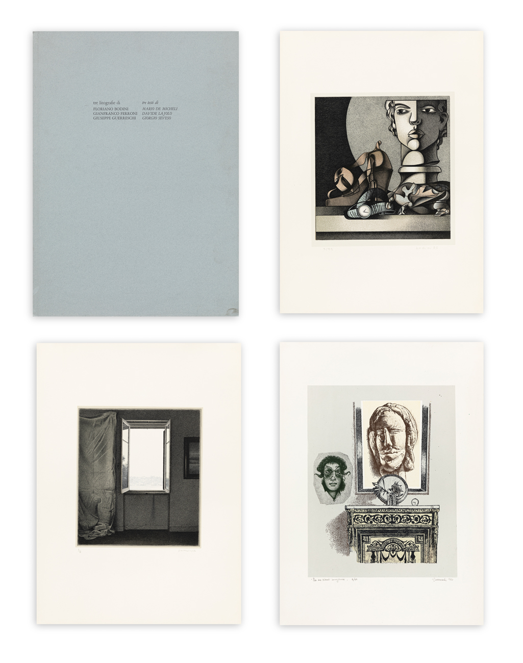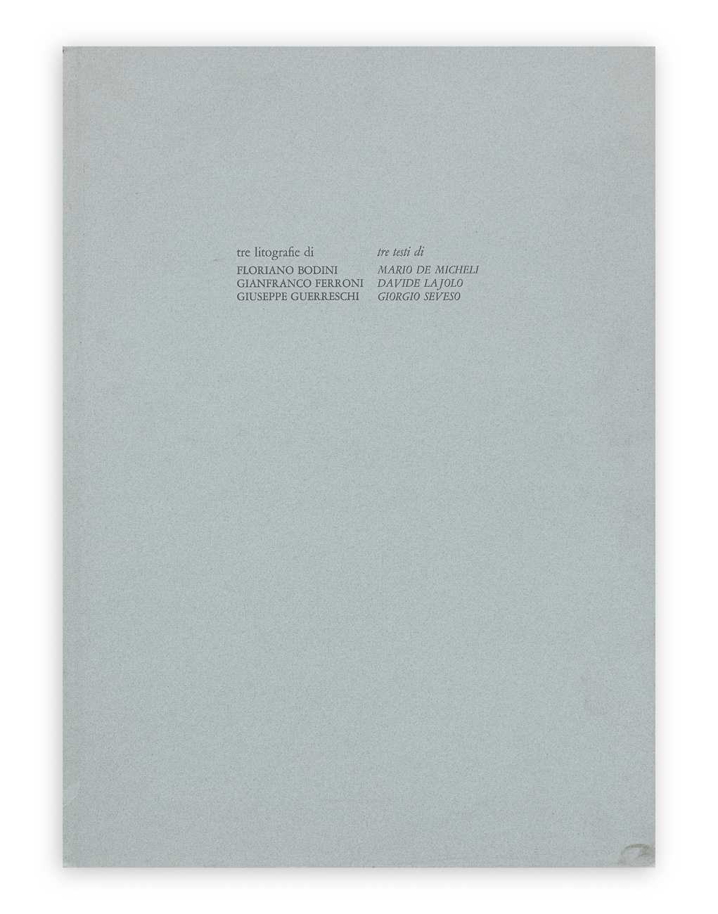 Cartella contenente testi di Mario de Micheli, Davide Lajolo, Giorgio Seveso e 3 litografie su carta Magnani di Pescia di Floriano Bodini, Ginfranco Ferroni, Giuseppe Guerreschi, ciascuna recante firma, datazione e numerazione (Esemplari 3/99) a matita al fronte