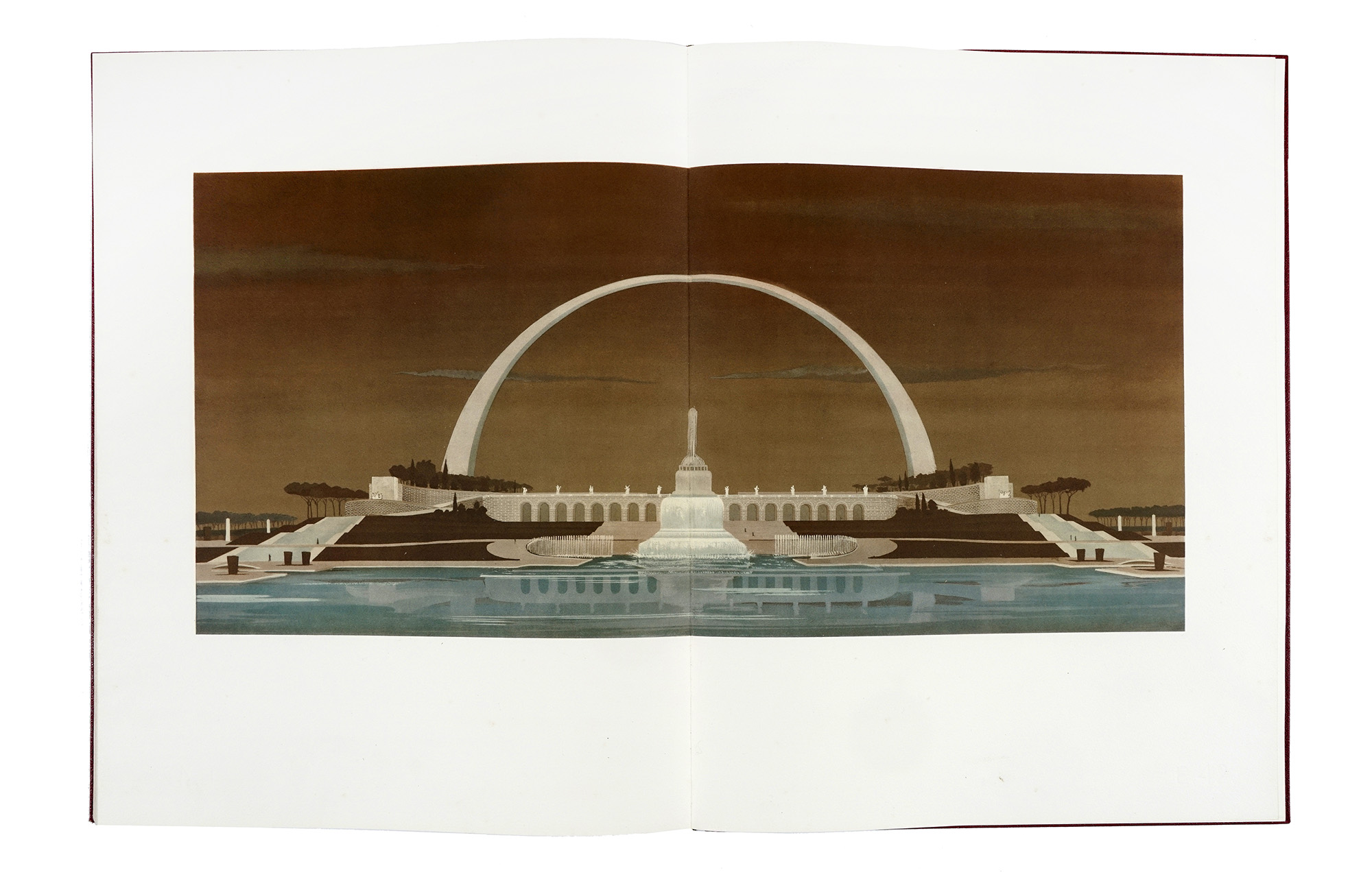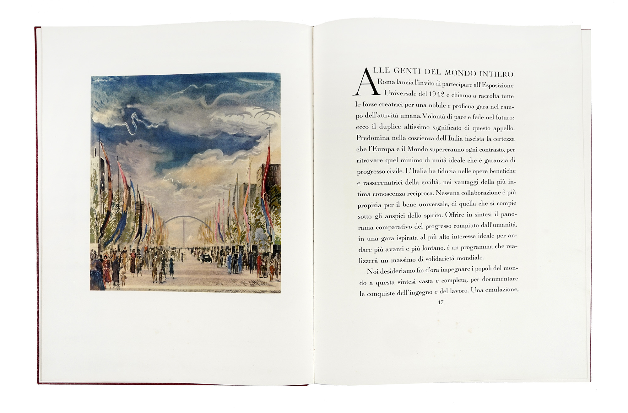 In-folio massimo (mm 580x445). Ottimo esemplare, leggermente fiorito, con 2 ritratti fotografici di Vittorio Emanuele III e di Mussolini e numerose grandi illustrazioni a colori nel testo, di cui 4 a doppia pagina. Legatura editoriale in similpelle rossa con fregio a secco sul piatto anteriore, fasci littori su quello posteriore e titoli in oro al dorso. Entro cartella editoriale in tela beige, con titoli al piatto, difetti ai tagli e fioriture ai piatti. Biglietto di Cipriano Efisio Oppo (pittore, critico d'arte e vice-presidente dell'Ente Autonomo Esposizione Universale di Roma) conservato all'interno, con segni di graffetta metallica. (1) Edizione di lusso, in 1200 esemplari, di quest'opera pubblicata da Vittorio Cini, per presentare l'Esposizione Universale che avrebbe dovuto aver luogo nel 1942, in un quartiere (denominato in acronimo EUR) appositamente progettato e costruito in stile razionalista per l'occasione. Le grandi tavole a colori, tra cui una di Sironi, raffigurano piante e prospetti di palazzi, molti dei quali portati a termine solo alla fine del conflitto mondiale. Scoppiata la guerra, fu sospesa la tiratura e bloccata la spedizione degli esemplari già stampati; per tali ragioni questa magnifica opera è estremamente rara.