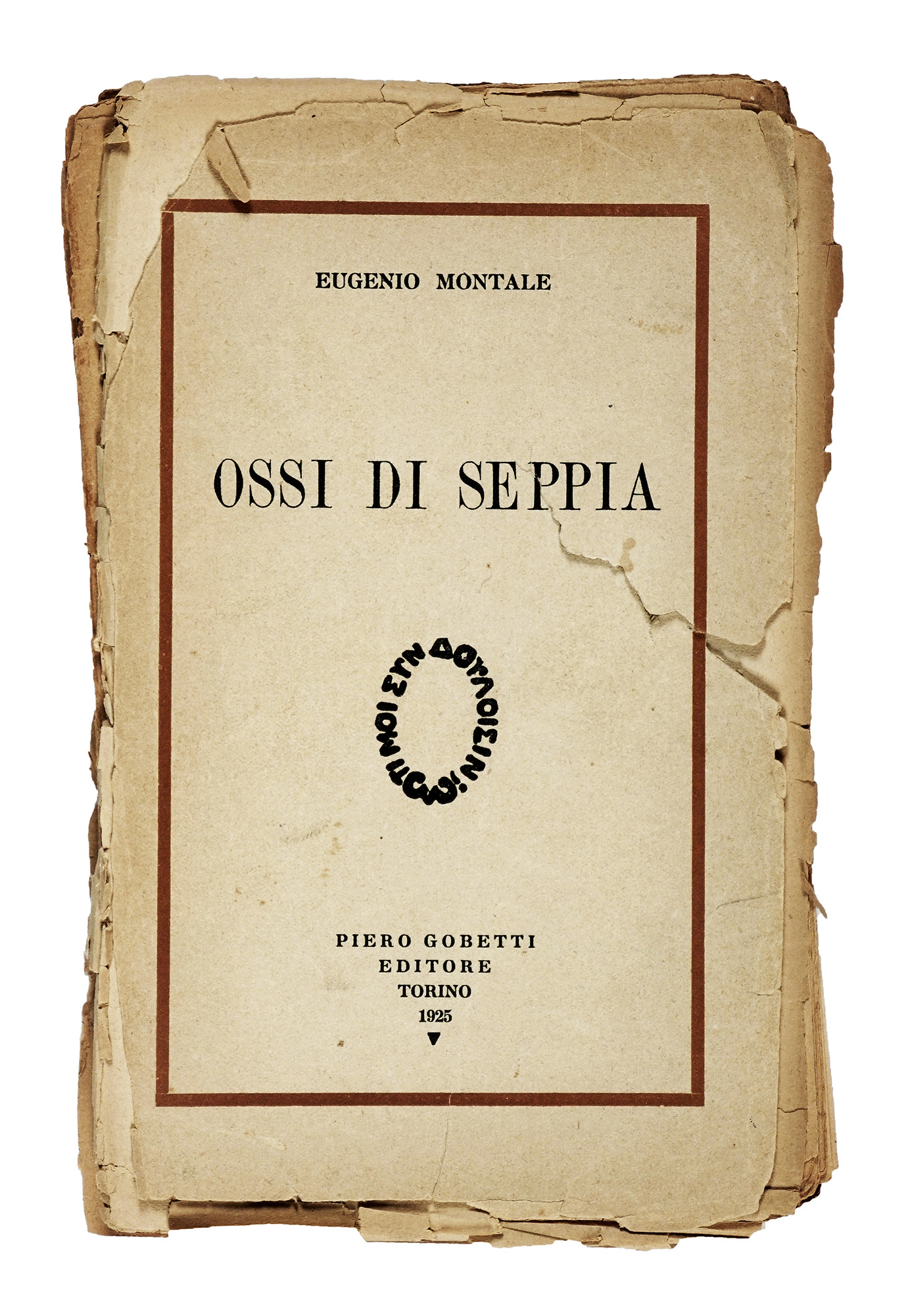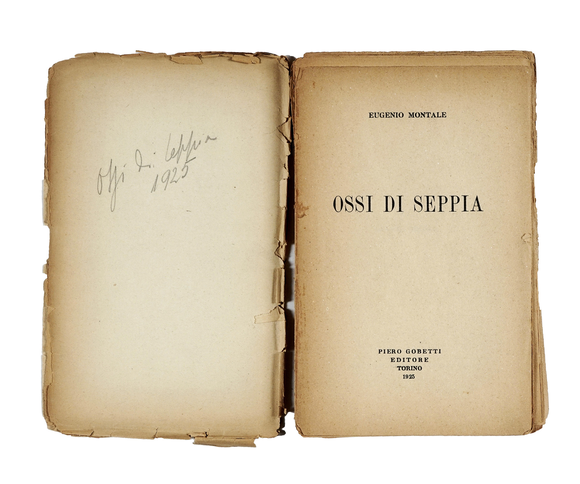 In-8° (mm 205x128). Pagine 100. Margine di pagg. 83-84 più corto 1 cm e di pagg. 89-90 di 0,8 cm. Esemplare completamente slegato, con un'annotazione a matita Ossi di Seppia 1925 al verso della prima carta bianca e alcune X a matita nel testo. Brossura editoriale originale con titoli e piccolo fregio realizzato da Felice Casorati impressi al piatto anteriore entro cornice di filetto singolo. Dorso assente, con il piatto anteriore più corto di margini, staccato e con un ampio strappo che coinvolge il testo; quello posteriore, fiorito e anch'esso staccato, presenta un'ampia mancanza al margine superiore esterno. Copia da studio. (1) Prima, rara edizione di «uno dei volumi più importanti della letteratura italiana [...] stampato da un editore molto ricercato dai collezionisti» (Gambetti-Vezzosi 549). Inizialmente proposta all'editore con il titolo Rottami, l'opera venne tirata in 1000 copie non numerate e un numero indefinito su carta di lusso e fu stampata con il contributo dello stesso Montale, che, sempre secondo Gambetti Vezzosi, «ne acquistò 240 copie, procurando sottoscrizioni di amici e conoscenti». Al suo interno vi si trovano 43 poesie scritte dall'Autore tra il 1916 e il 1924.