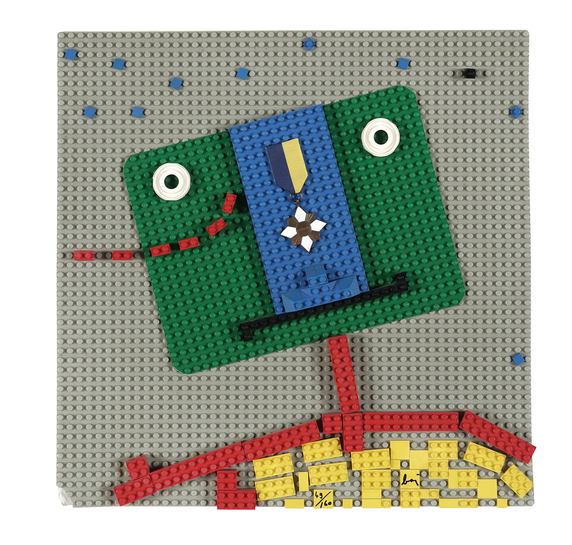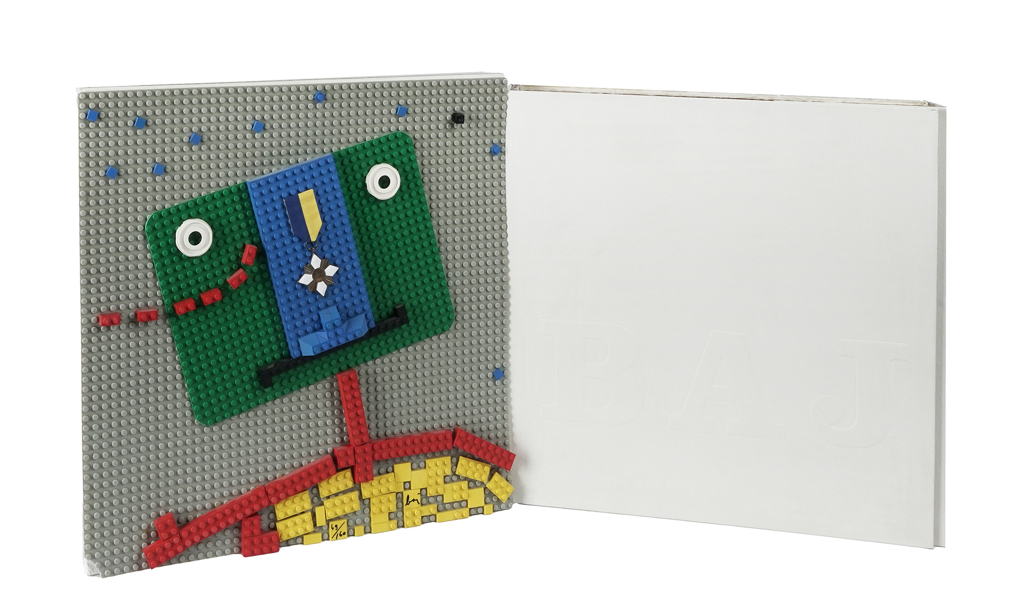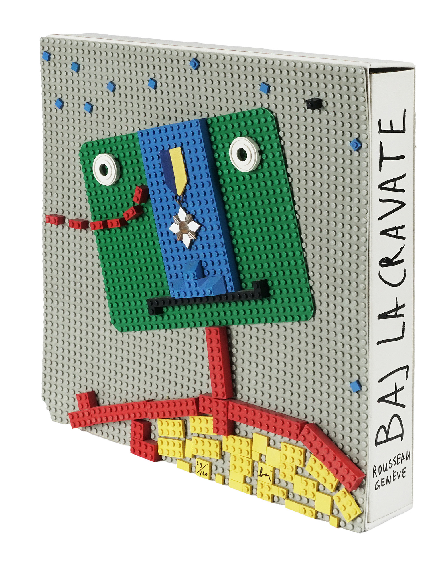 In-folio (mm 380x380). Con due collage numerati e firmati a matita da Enrico Baj e un collage su cartoncino nero, il tutto sciolto e fuori testo. Esemplare a bifoli sciolti, stampati in serigrafia e litografia a colori, con molti interventi manuali a collage nel testo, incluso quello su due pagine con la cravatta in plastica multicolore, che dà il titolo all'opera. Il tutto perfettamente conservato entro cartella in cartone editoriale con grande tassello cartaceo al piatto anteriore, entro chemise in cartone rivestito in similpelle bianca, con il nome dell'Artista in rilievo al piatto anteriore e titoli in nero al dorso; lievi tracce di polvere. Custodia originale in similpelle bianca, con un bellissimo multiplo in LEGO numerato 49/160 e firmato dall'Artista al piatto anteriore. Staccato, ma presente, l'angolino inferiore sinistro del multiplo. Esemplare n. 49 su una tiratura complessiva di 200, uno dei 35 contenenti due collage numerati da 1 a 75. (1)