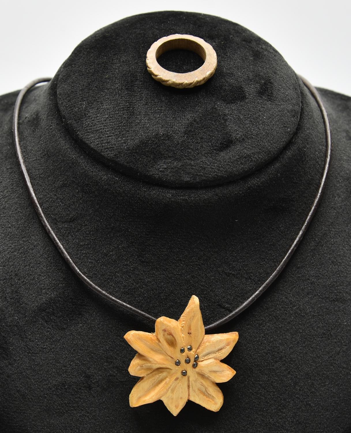 collana con cordino in pelle e pendente in legno a forma di fiore; anello in legno misura 8