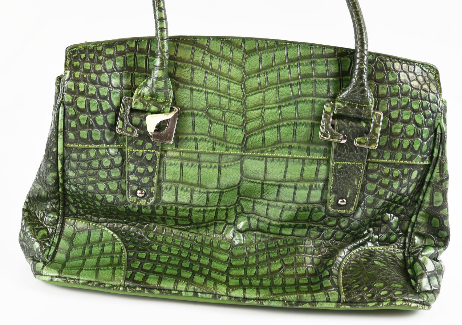 Borsa modello shopper in eco pelle stampa rettile e doppi manici. Chiusura frontale con patta. Interno foderato in tessuto organizzato in tre vani, uno chiuso con cerniera, tre taschini laterali, due piatti e uno chiuso con cerniera. Hardware in metallo cromato. Presenta tag porta indirizzo con applicato logo metallico. Cm 35,50x27,00x15,50. Altezza coi manici cm 47,00. Ben conservata.