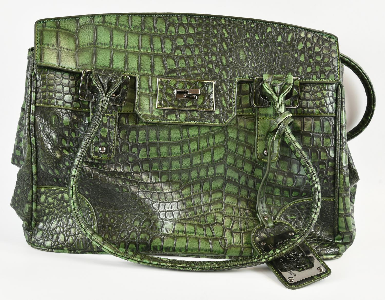 Shopper bag in eco-leather with a reptile print and double handles. Front closure with a flap. The fabric-lined interior is organized into three compartments, one with a zipper, and three side pockets, two flat and one with a zipper. Chrome-plated metal hardware. Features an address tag with an attached metal logo. Dimensions: 35.50 x 27.00 x 15.50 cm. Height including handles: 47.00 cm. Well preserved.