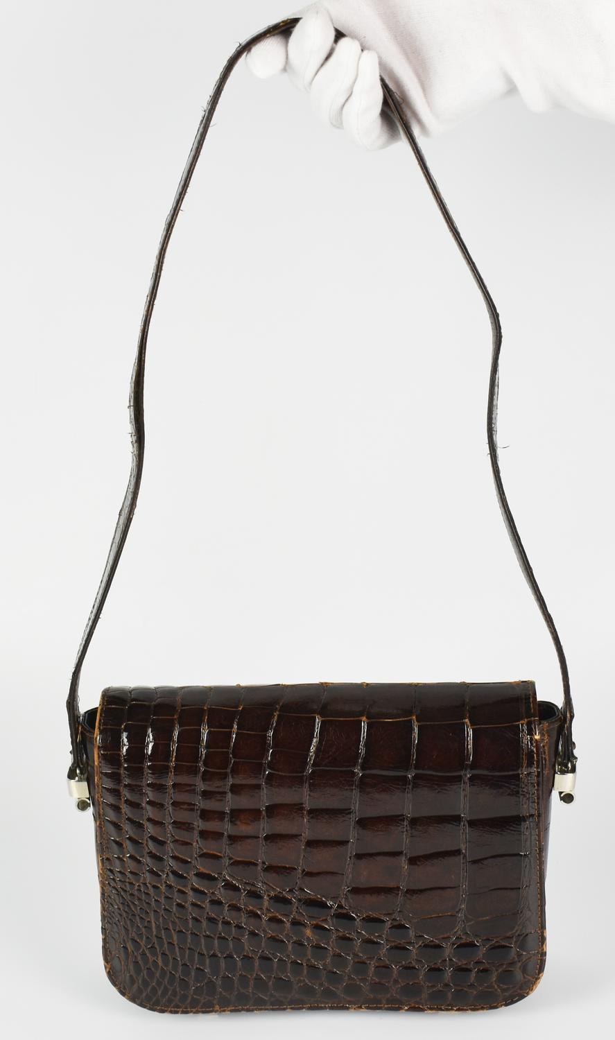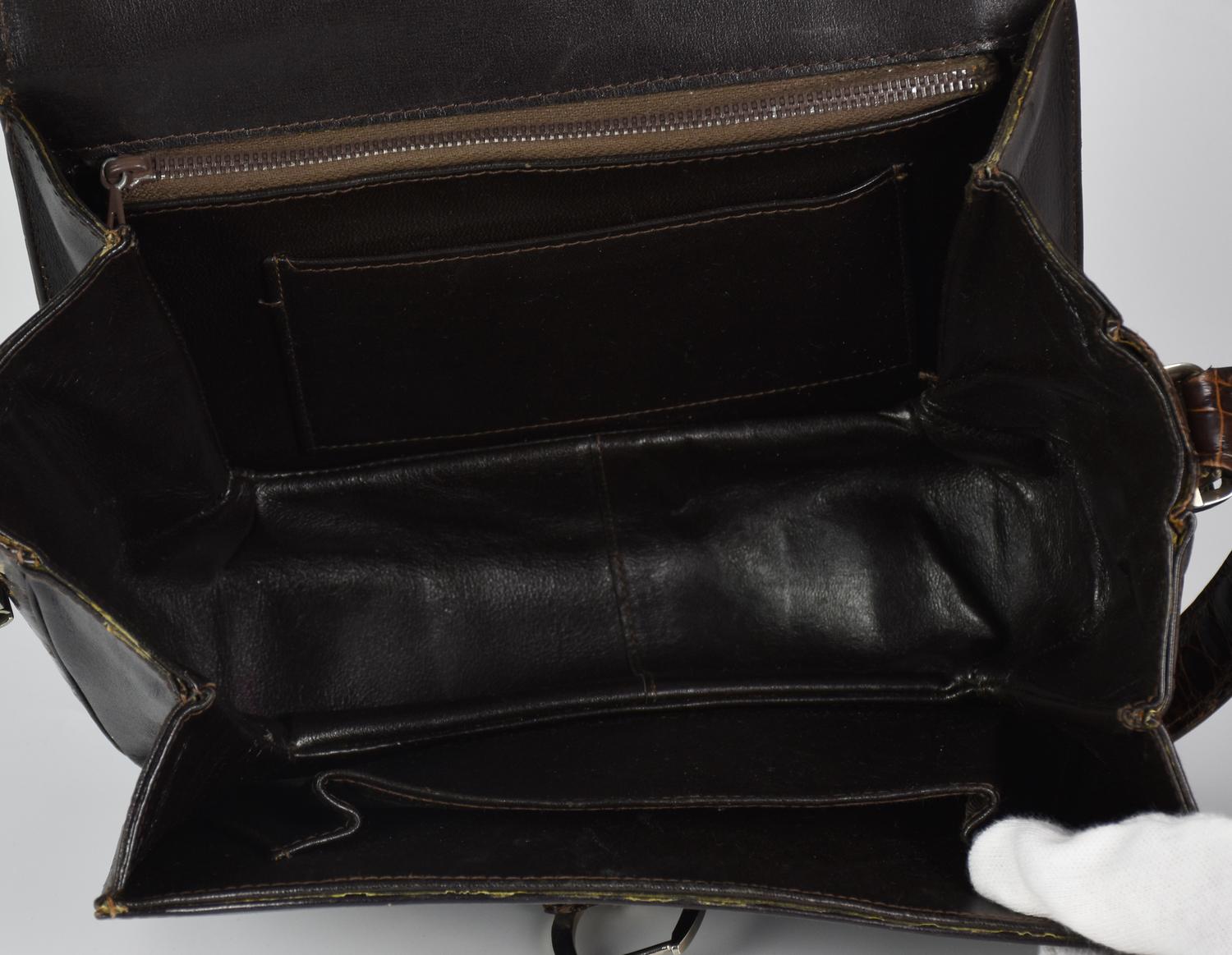 Shoulder bag in dark brown crocodile leather. Snap closure with metal buckle and non-adjustable shoulder strap. Smooth leather interior organized into a single compartment with three side pockets: one flat, one pleated, and one with a zipper. Likely produced in the 1960s, still with the mirror included. Chrome metal hardware. Dimensions: 22.5x19.0x7.5 cm. Height with shoulder strap: 50.0 cm. Shows signs of wear and age. Fairly well preserved.