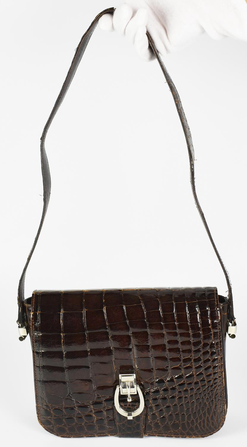 Borsa a spalla in pelle di coccodrillo color testa di moro. Chiusura a scatto con fibbia metallica e tracolla non regolabile. Interno in pelle liscia organizzato in un unico scomparto e tre taschini laterali, uno piatto, uno a soffietto e uno con cerniera. Modello di probabile produzione anni ’60 con ancora lo specchietto in dotazione. Hardware in metallo cromato. Cm 22,50x19,00x7,50. Altezza con tracolla cm 50,00. Presenta segni d’uso e del tempo. Discretamente conservata.