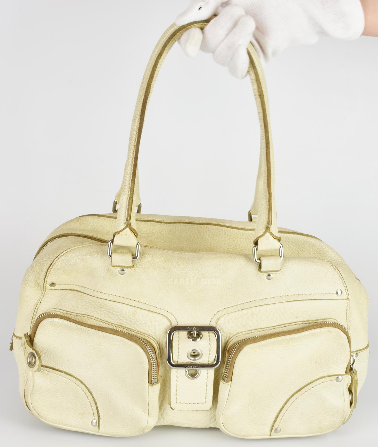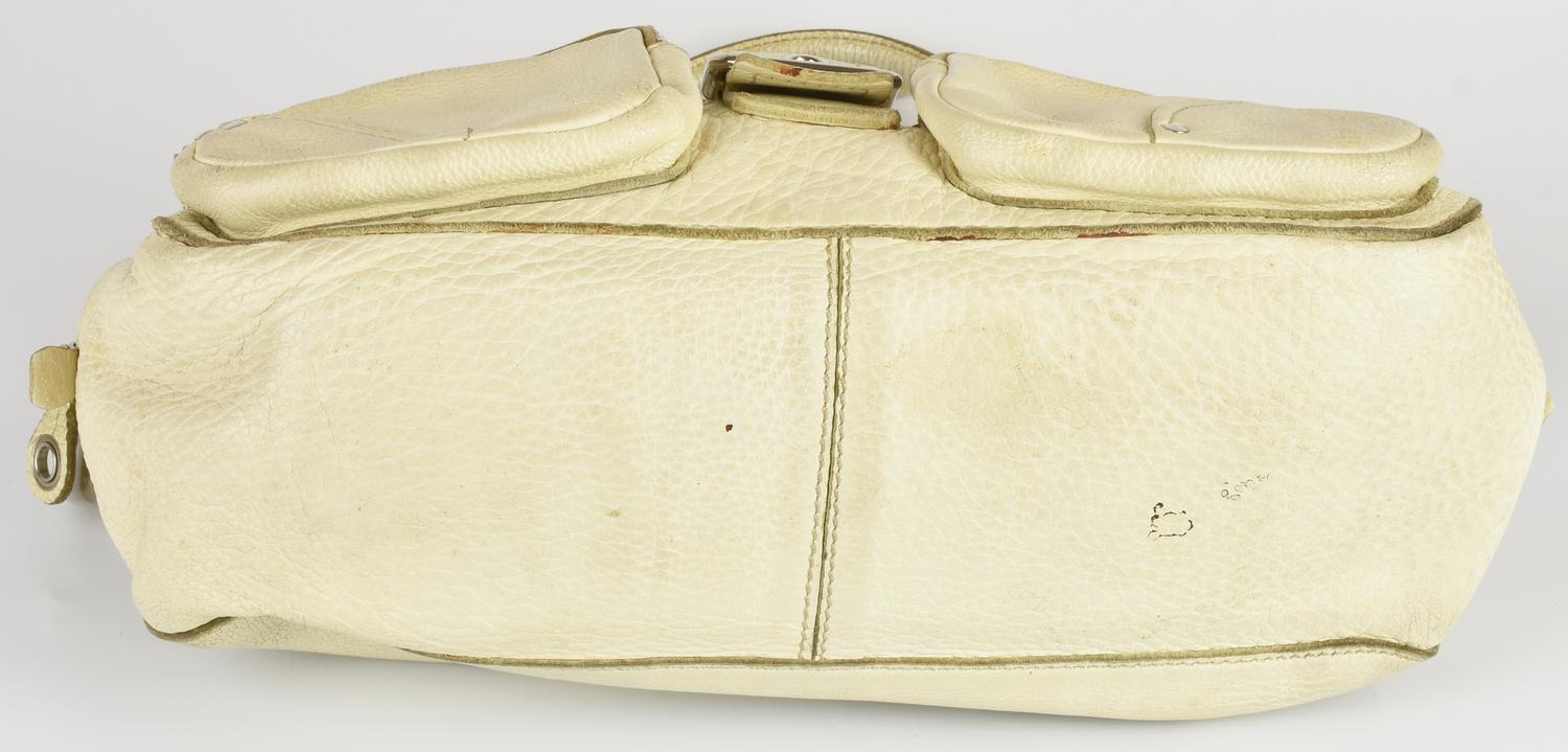 Shoulder bag in leather with double handles. Zipper closure. The interior is organized in a single compartment with a zipper pocket. The exterior features two front pockets with zipper closures. Chrome metal hardware. Dimensions: 32.00 x 20.00 x 11.50 cm. Height with handles: 39.00 cm. Product reference code: 122. Made in Italy. Noticeable signs of use. Fairly well preserved.