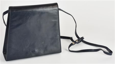 Piccola borsa a spalla rigida a trapezio. Tracolla rimovibile. Chiusura frontale con patta. Interno organizzato in un unico vano con due taschini laterali, uno piatto e uno con cerniera. Cm 20,00x18,00x6,00. Ben conservata.