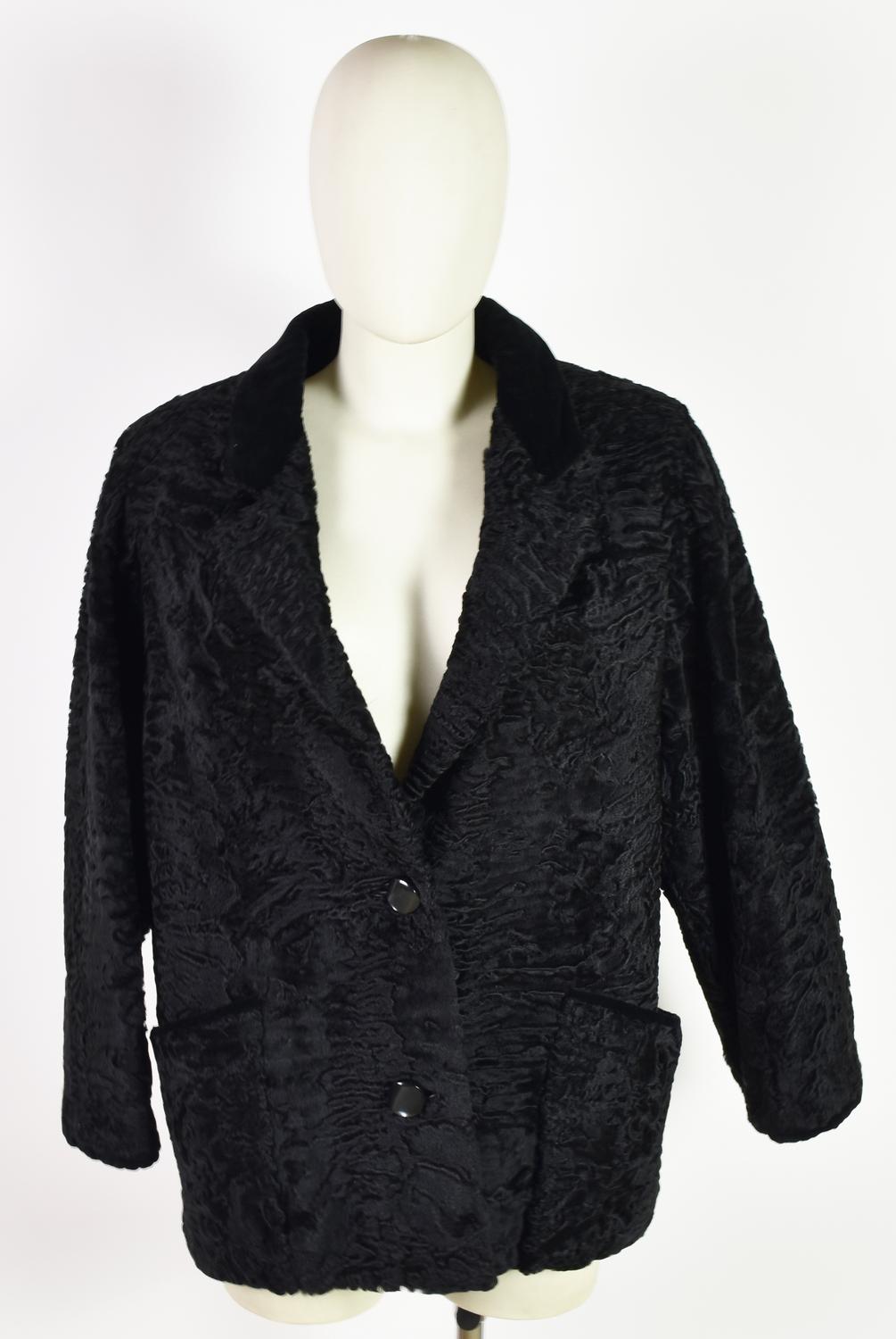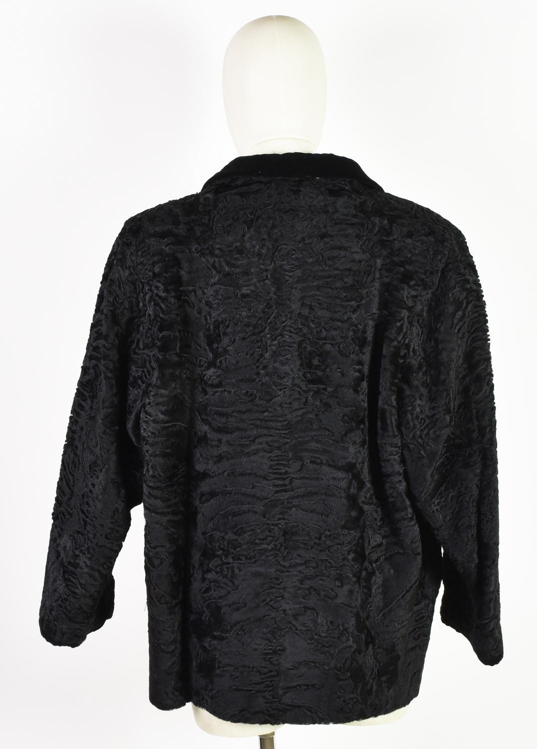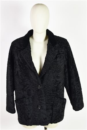 Pelliccia di Astrakan con particolari in velluto nero, lavorazione artigianale. Lunghezza cm 73, diametro cm 114. Pellicceria Sorari, Milano. Ben conservata.