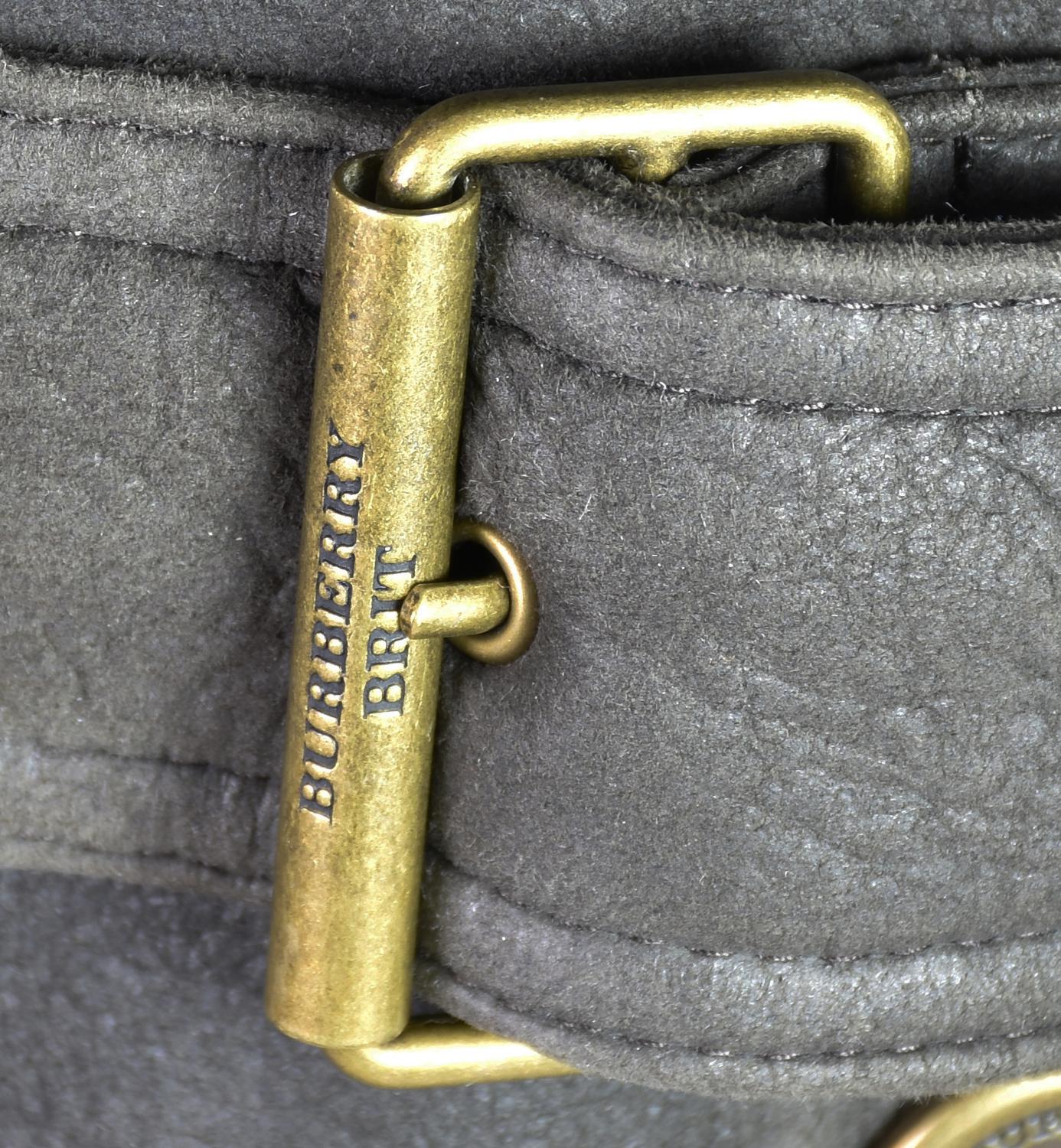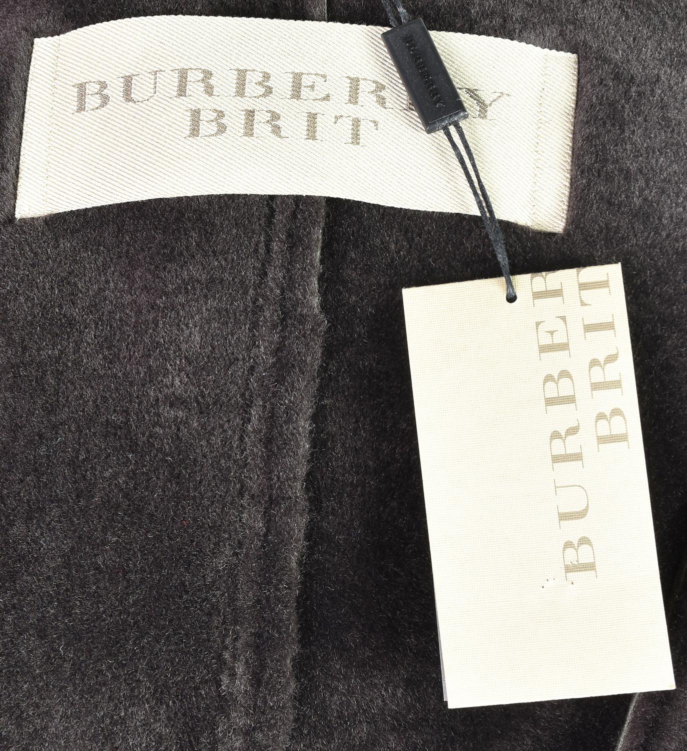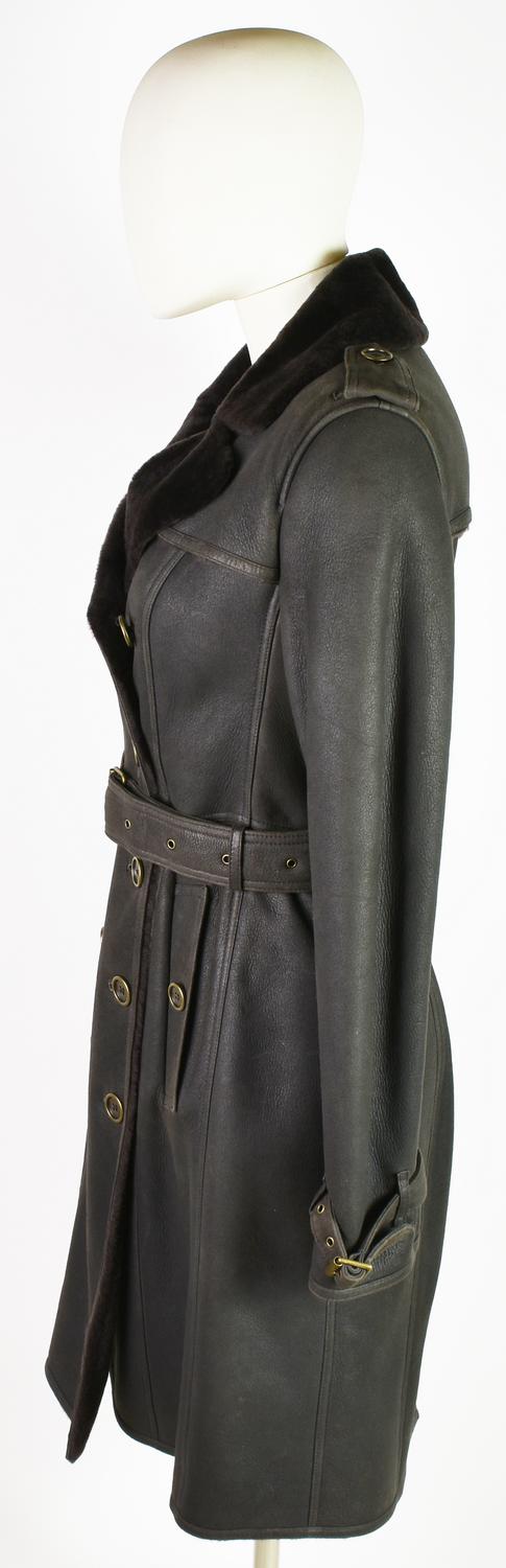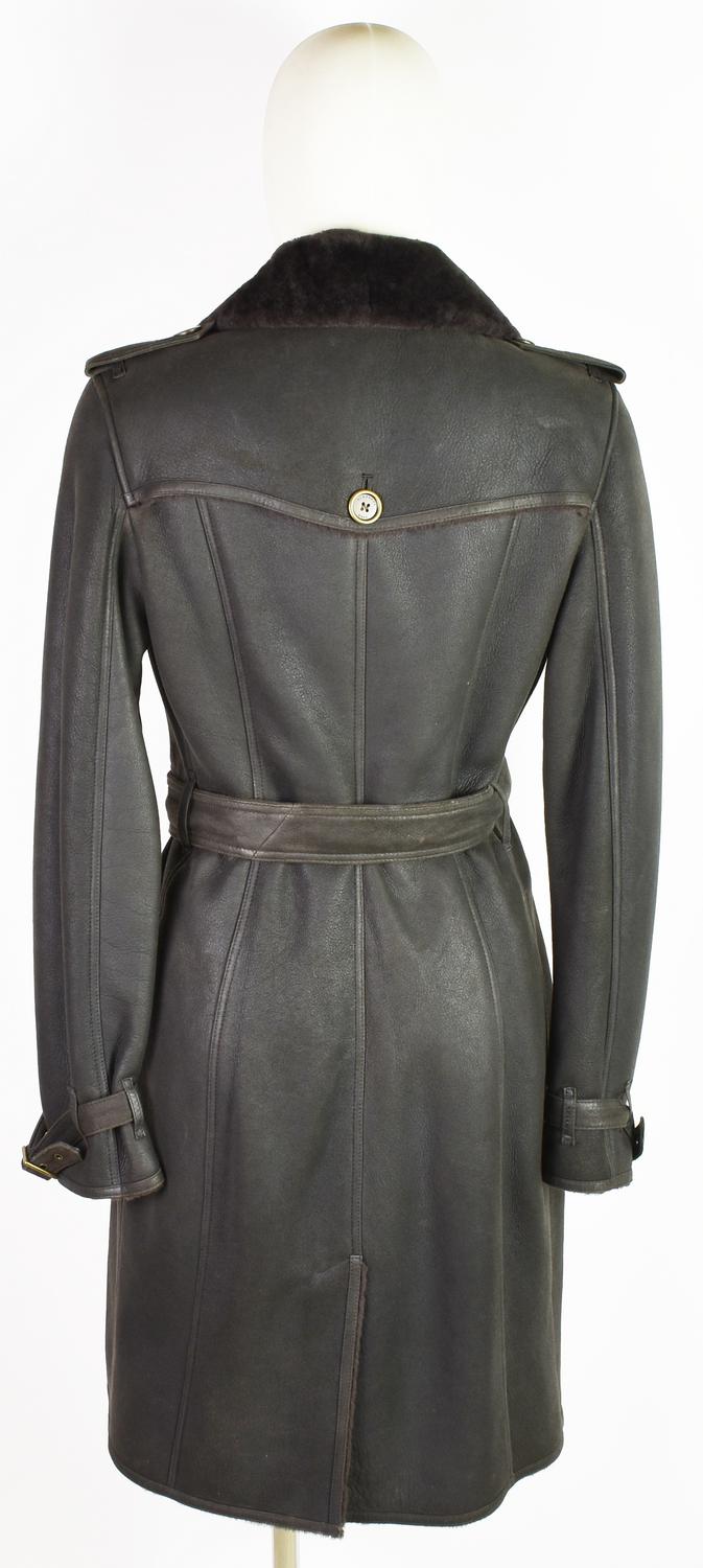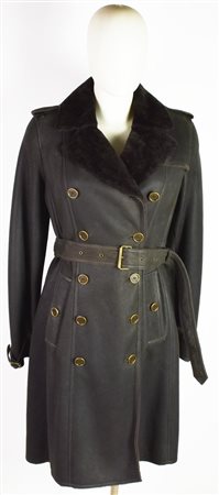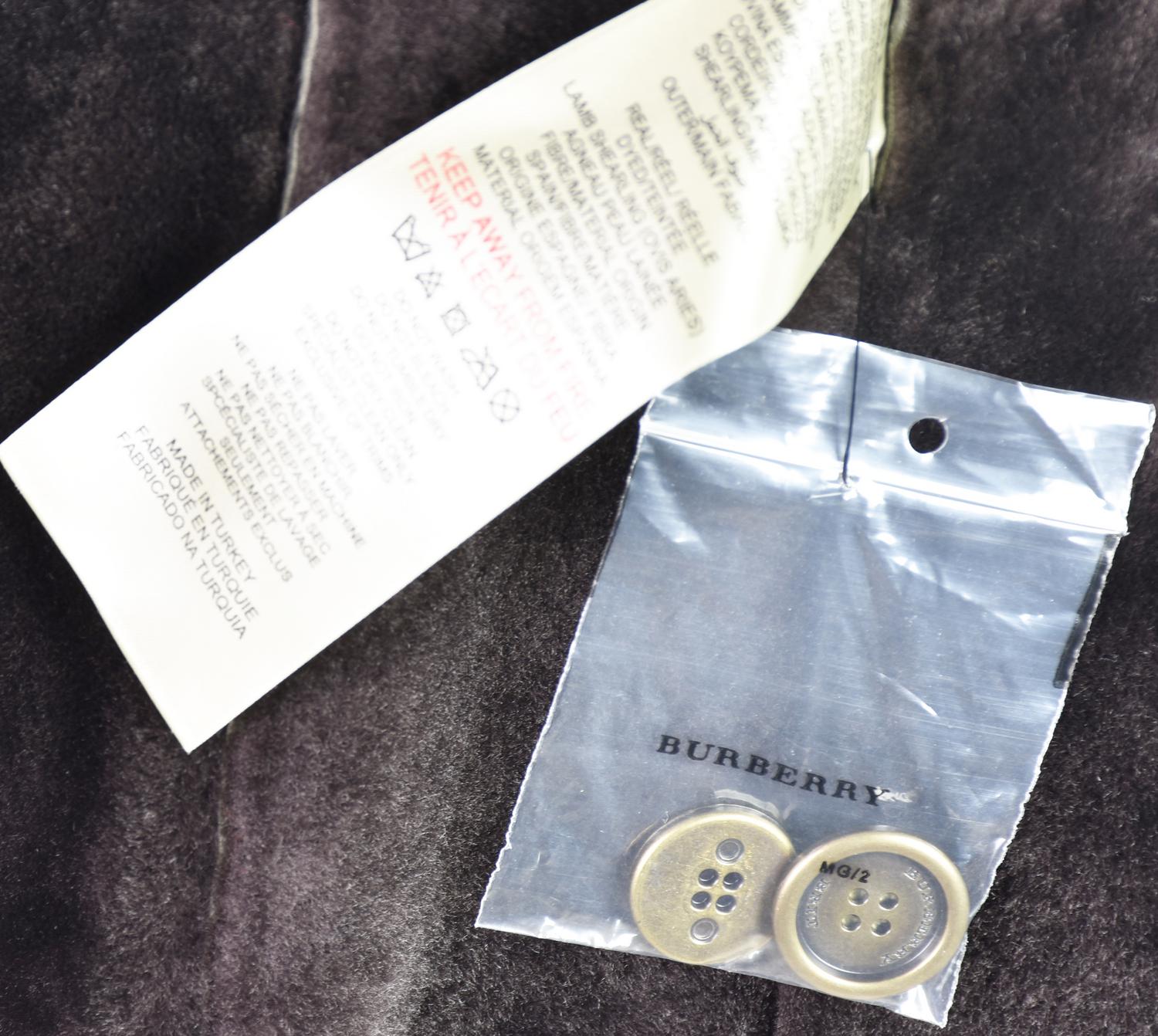 Cappotto doppiopetto da donna in pelle d'agnello. Presenta cintura in vita, due cinturini decorativi sulle maniche e bottoni in metallo con inciso il nome della Maison. Tasche a filetto. Taglia 42 IT. Proposto con copriabiti in plastica originale Burberry. Prodotto in Turchia. Eccellente, ancora con cartellino.