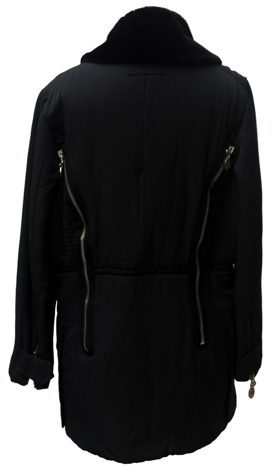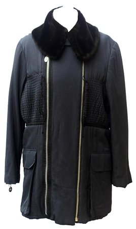 dark gray wool caban lined in eco fur. Long zips running through the length and in the sleeves are making stronger the look of the caban, big patch pockets with flaps, eco fur collar, embossed effect on both side of the bust. Custom zip pullers. Made in Italy. Anni 80.Size IT 42. Excellent condition.