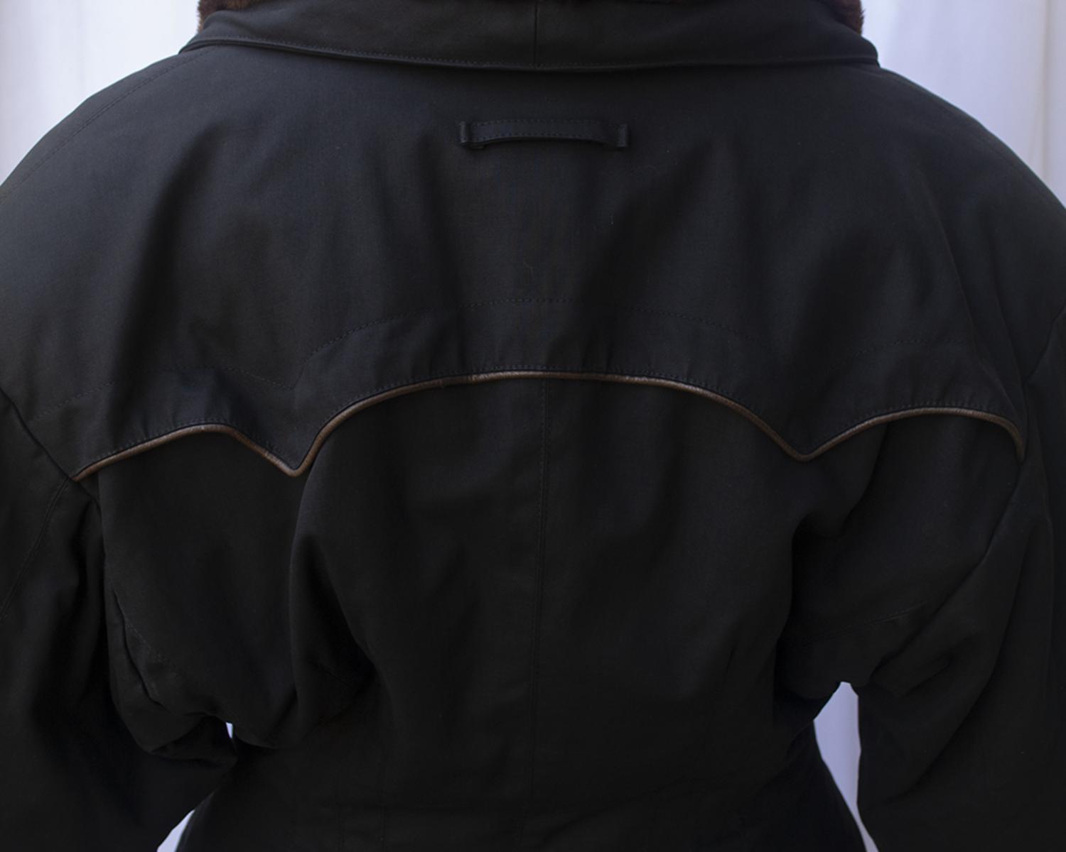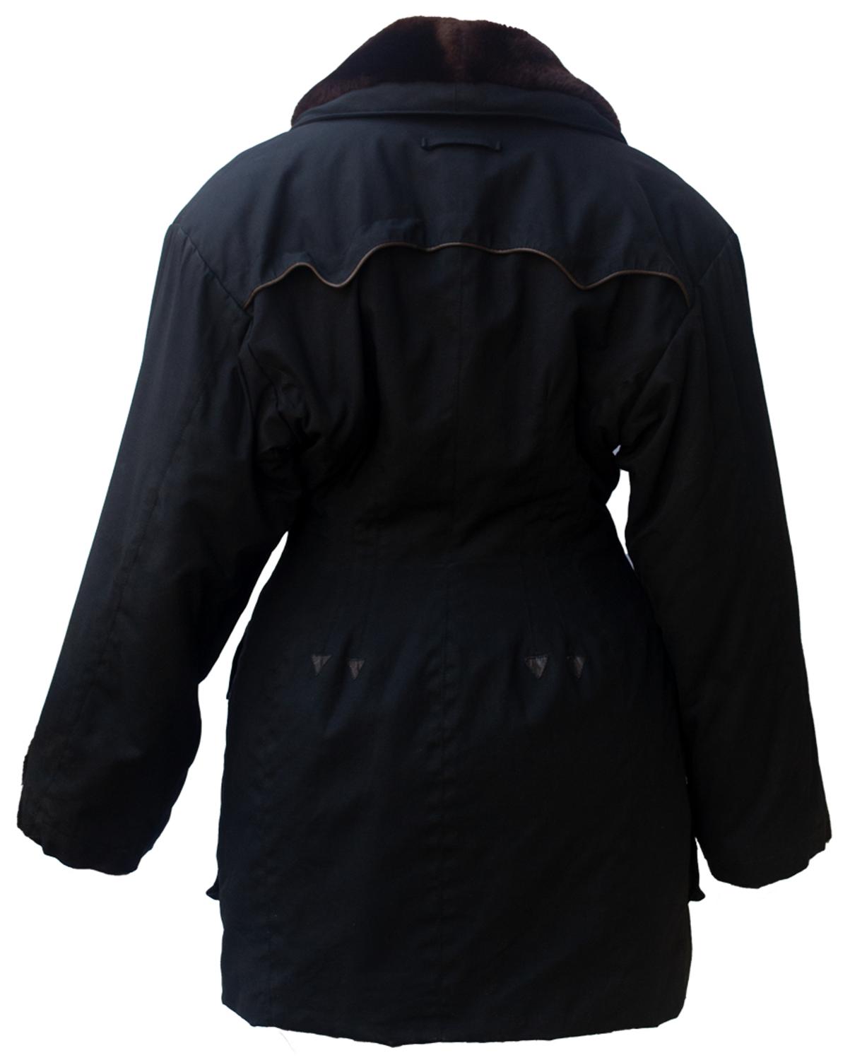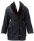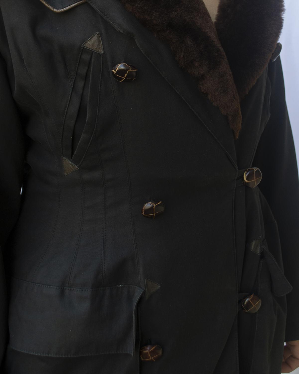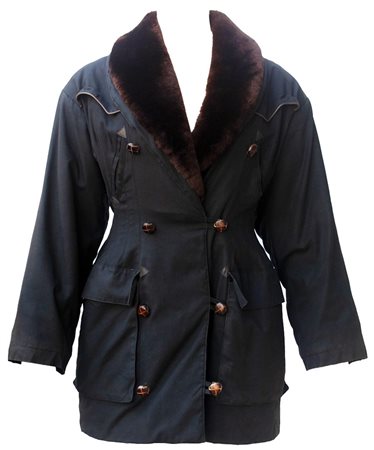 double breasted caban in cotton waxed, lining and shawl collar in eco fur, 4 pockets: two big patch pockets with flaps and two double welt pockets on the chest. Color dark grey . Classic Montgomery buttons in leather cuir. Made in Italy by Gibò in middle ‘80s. Size IT 42. Perfectly preserved.