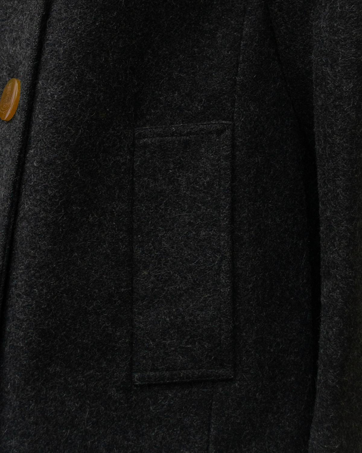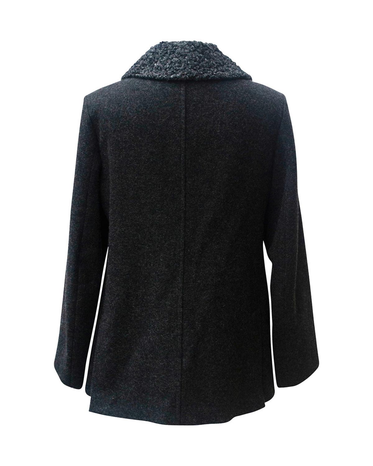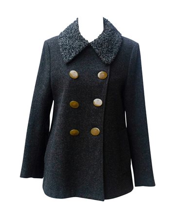 Dark Grey Melton fabric for this double breasted lined caban. Giant Orb Buttons, astrakan pattern for the ecofur collar, side welt pockets. Early ’90. Size IT 42. Made in Italy. Perfectly preserved.