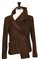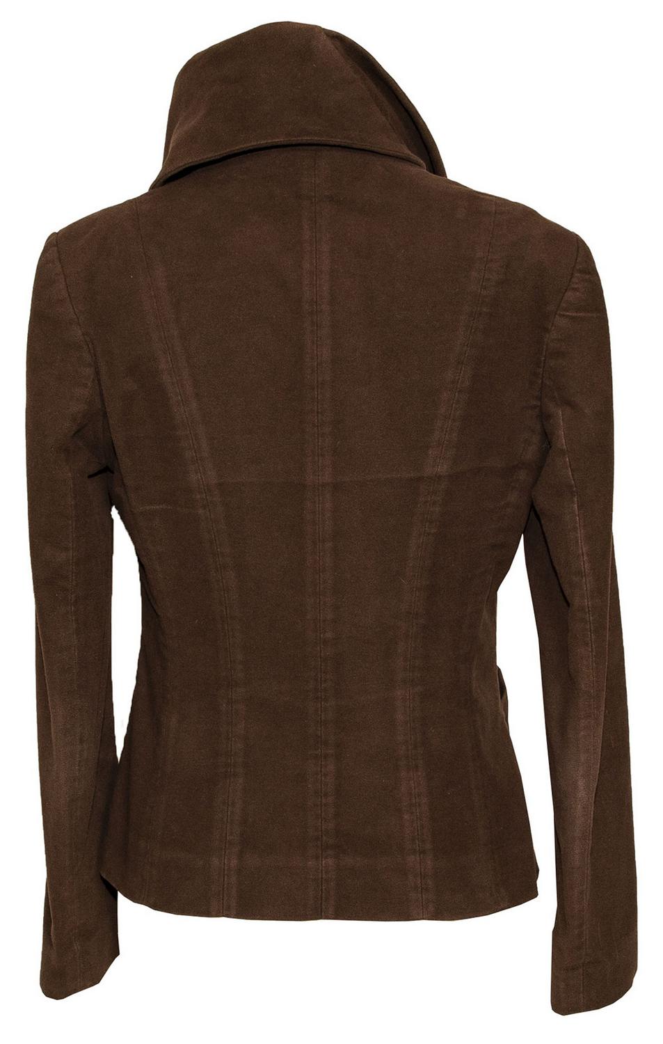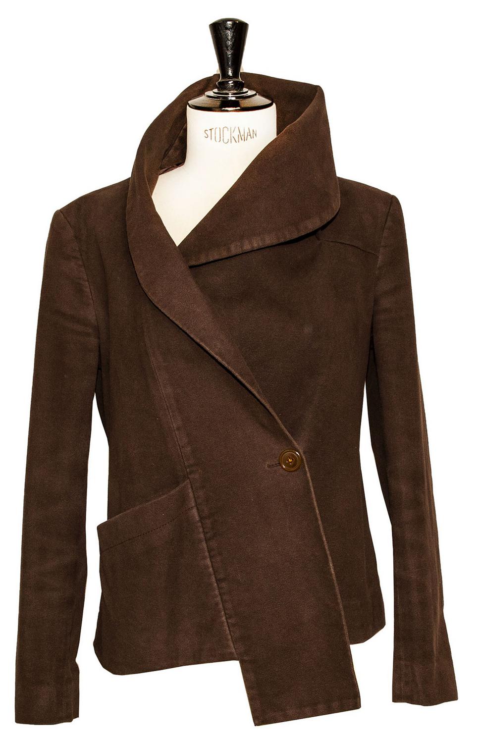 giacca con ampio e assimmetrico collo a scialle allacciata a doppiopetto semifoderata, realizzata in tessuto fustagno di cotone, colore marrone. Grande tasca applicata sul lato destro. Taglia IT 42 Made in Italy. Anni ‘90.