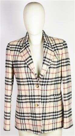 Giacca da donna a due bottoni in lana nell'iconico motivo della Maison. Presenta due tasche e un taschino applicati. Taglia 10 UK. Prodotto in Italia. Perfettamente conservata.