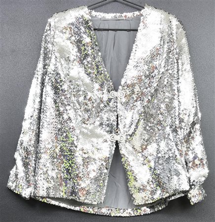 Giacca con decoro di paillettes argentate. Manca etichetta di taglia e composizione. Made in Italy. Lavorazione sartoriale. Vista la natura dell’articolo non si escludono piccole mancanze. Ben conservata.