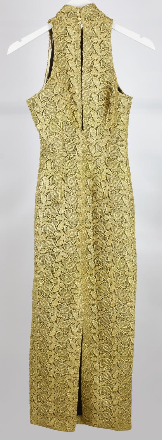Abito dorato con scollo all’americana. Spacco nella parte posteriore. Cerniera laterale e chiusura al collo con bottoncini gioiello. Taglia 44 IT. Prodotto in Italia. Indossato una volta sola. Perfettamente conservato.