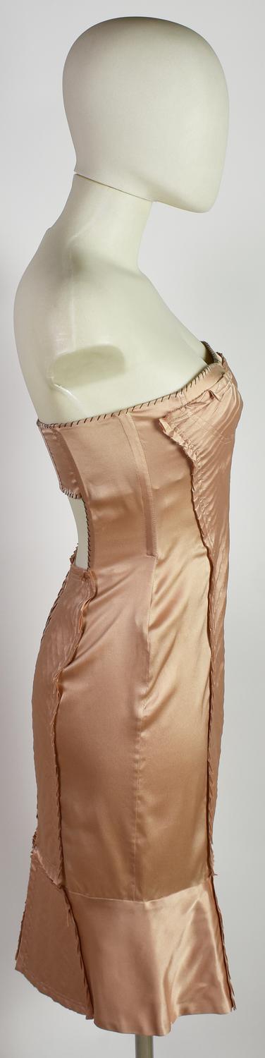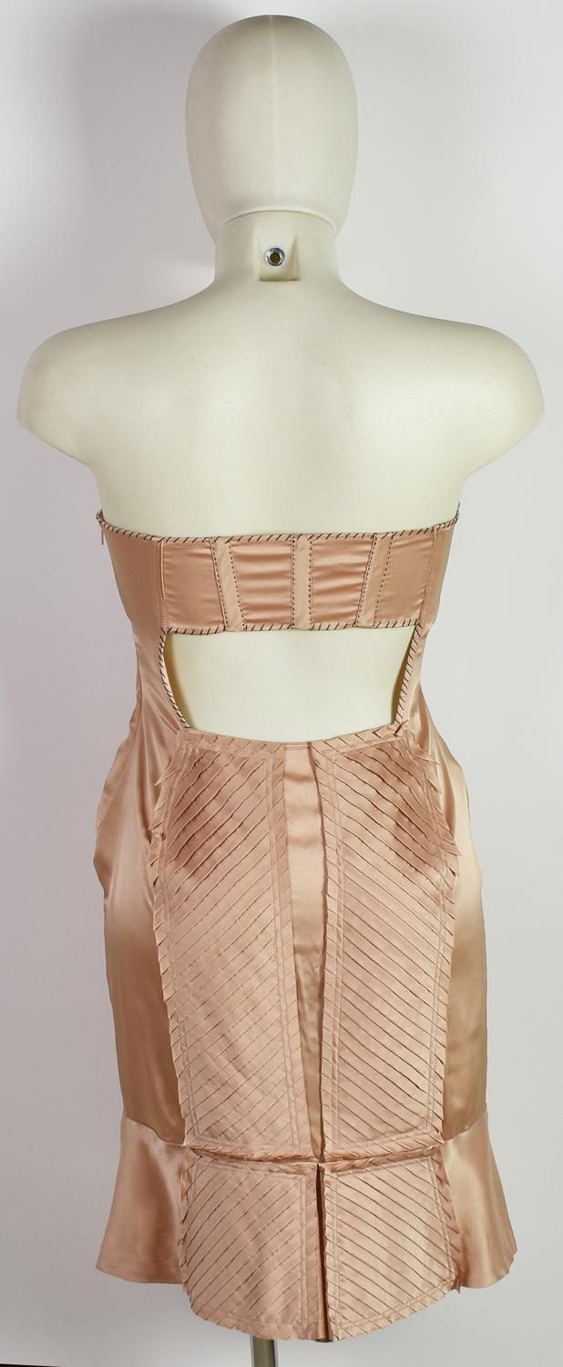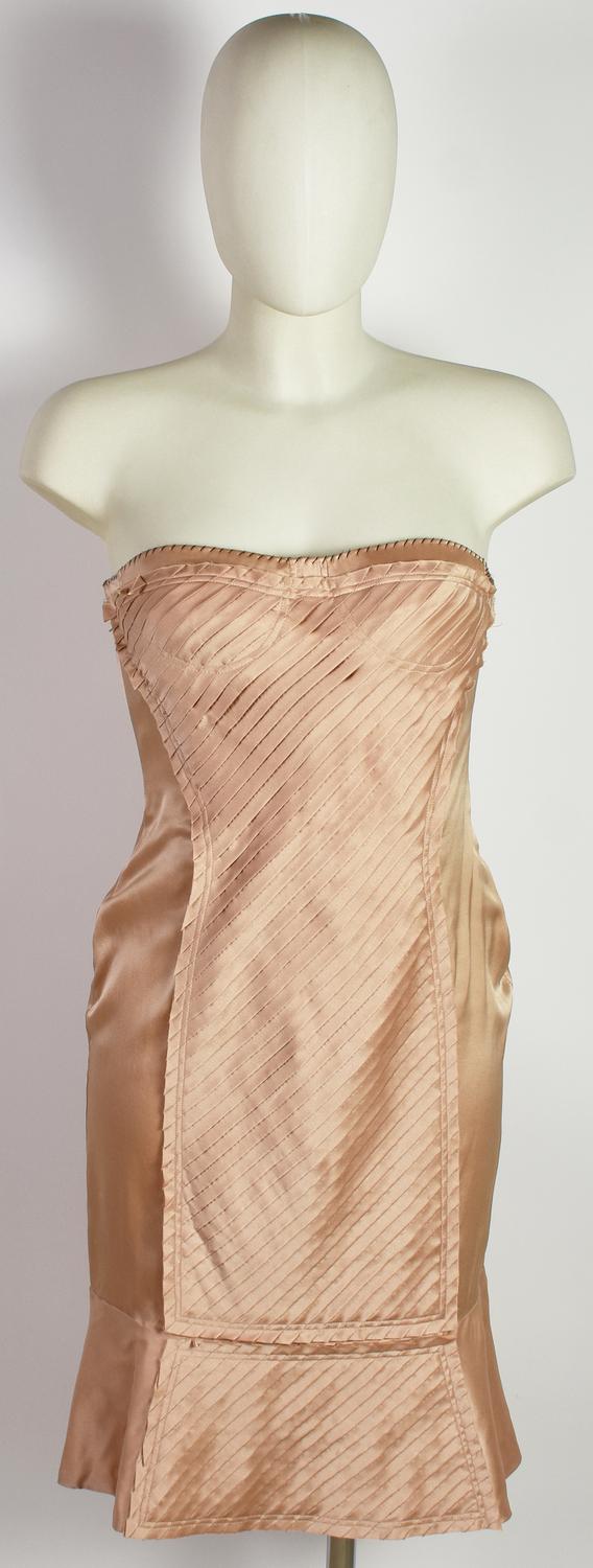 Mini abito in seta color cipria con lavorazioni a mano e applicazioni di tessuto plissettato. Corpetto con stecche e apertura sulla schiena. Anni ’90, designer Tom Ford. Taglia 38 IT. Prodotto in Italia. Perfettamente conservato.