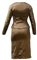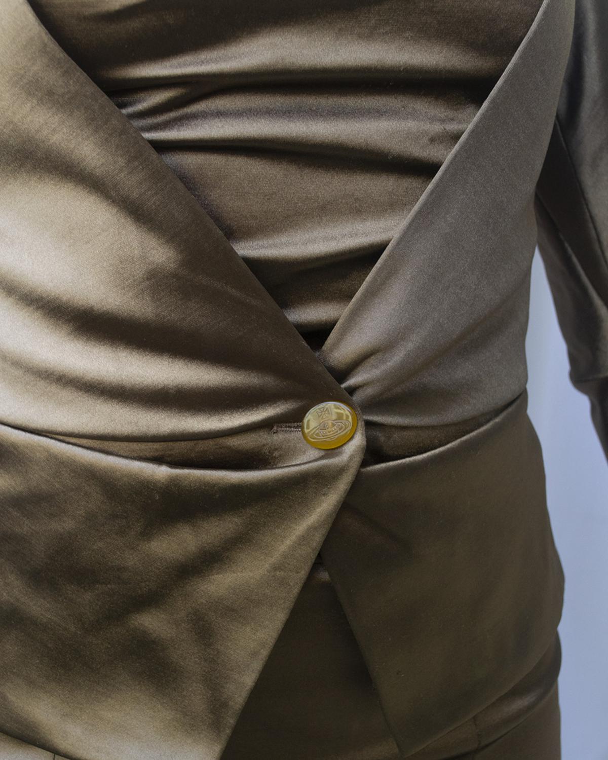 Completo composto da tre capi: una giacca monopetto sfoderata un bottone, un top a corpetto e una gonna realizzata in un tessuto elasticizzato lucido color bronzo antico. Prodotto in Italia nei primi anni '90. Taglia IT 42. Perfettamente conservato.