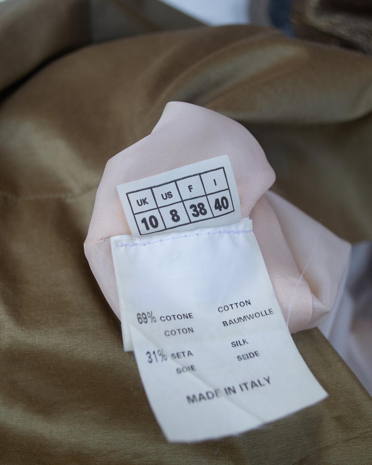 abito foderato, fatto in tessuto taffetà di seta e cotone color oro, collo sciallato su ampia scollatura, due spacchi laterali nella parte posteriore, lunghezza al ginocchio, zip centrale dietro. Ben conservato.Taglia UK 10, Made in England. Dai primi anni '90. Gold Label. Perfectly preserved.