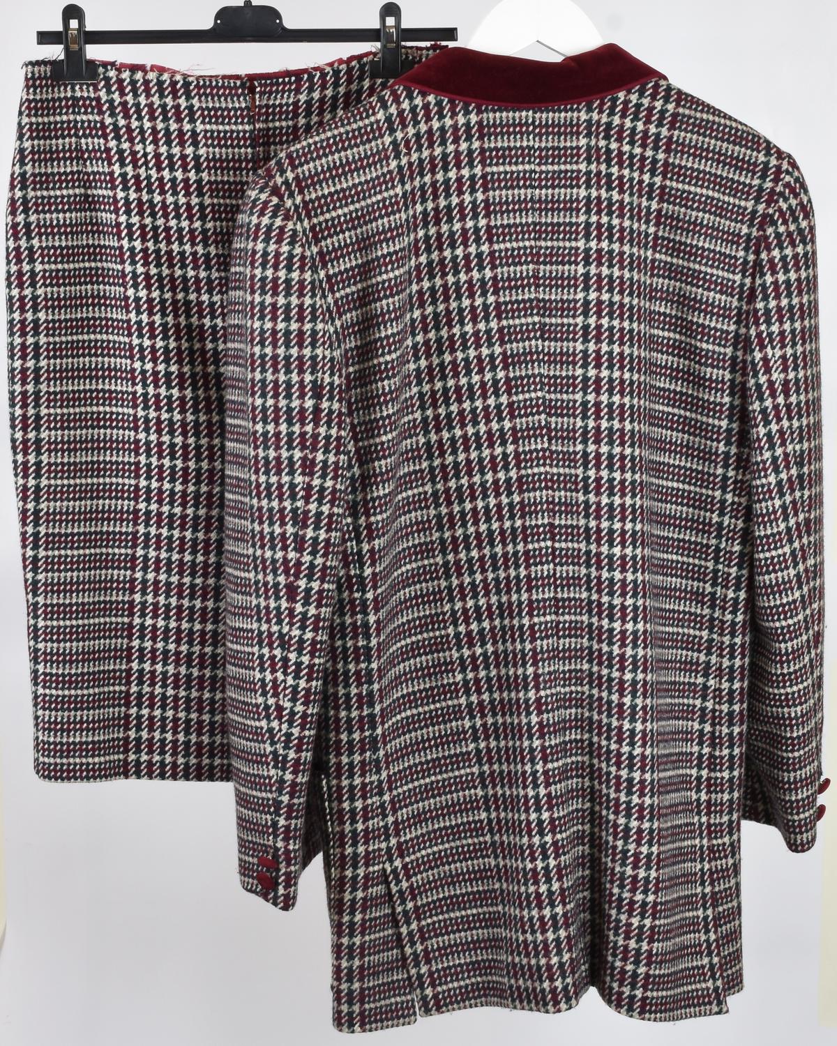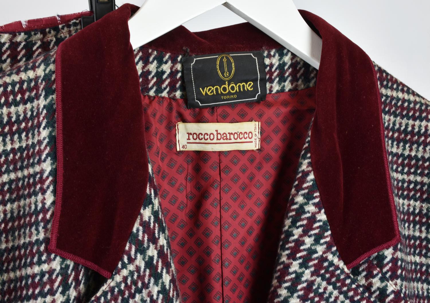 Two-piece wool suit with cupro lining. The jacket features a single-breasted closure, velvet collar, and a metal logo button. Two front flap pockets. Inside, there is a brand label and a retailer label from Vendome in Torino. Size 40 IT. Made in Italy. Defects in the lining of the skirt. Well preserved.