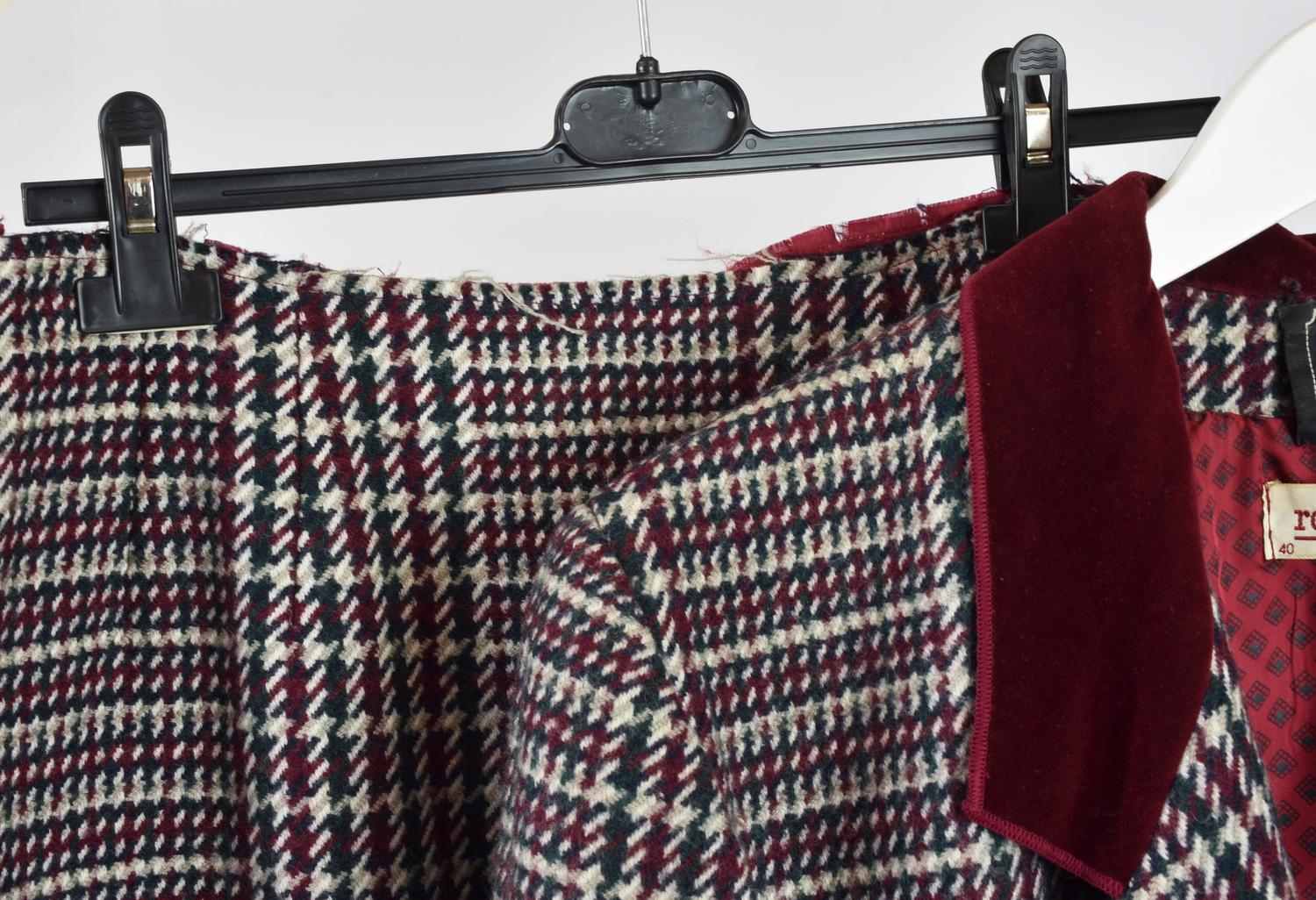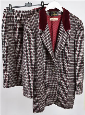 Tailleur due pezzi in lana con fodera in cupro. Giacca con chiusura monopetto, colletto in velluto e bottone metallico logato. Due tasche frontali a patta. All’interno etichetta del marchio e del rivenditore Vendome di Torino. Taglia 40 IT. Prodotto in Italia. Difetti nella fodera della gonna. Ben conservato.