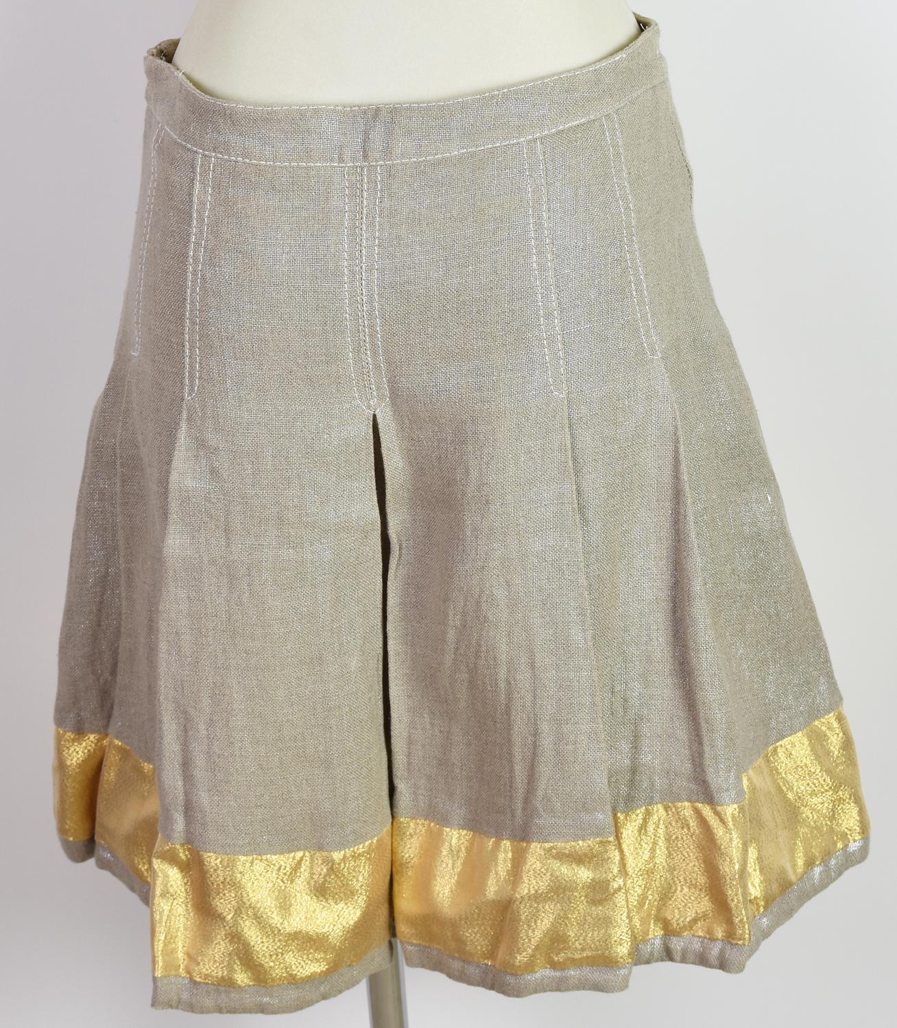 Gonna a pieghe in lino con dettaglio dorato. Chiusura laterale con cerniera. Taglia 42 IT. Prodotto in Italia. Perfettamente conservato.