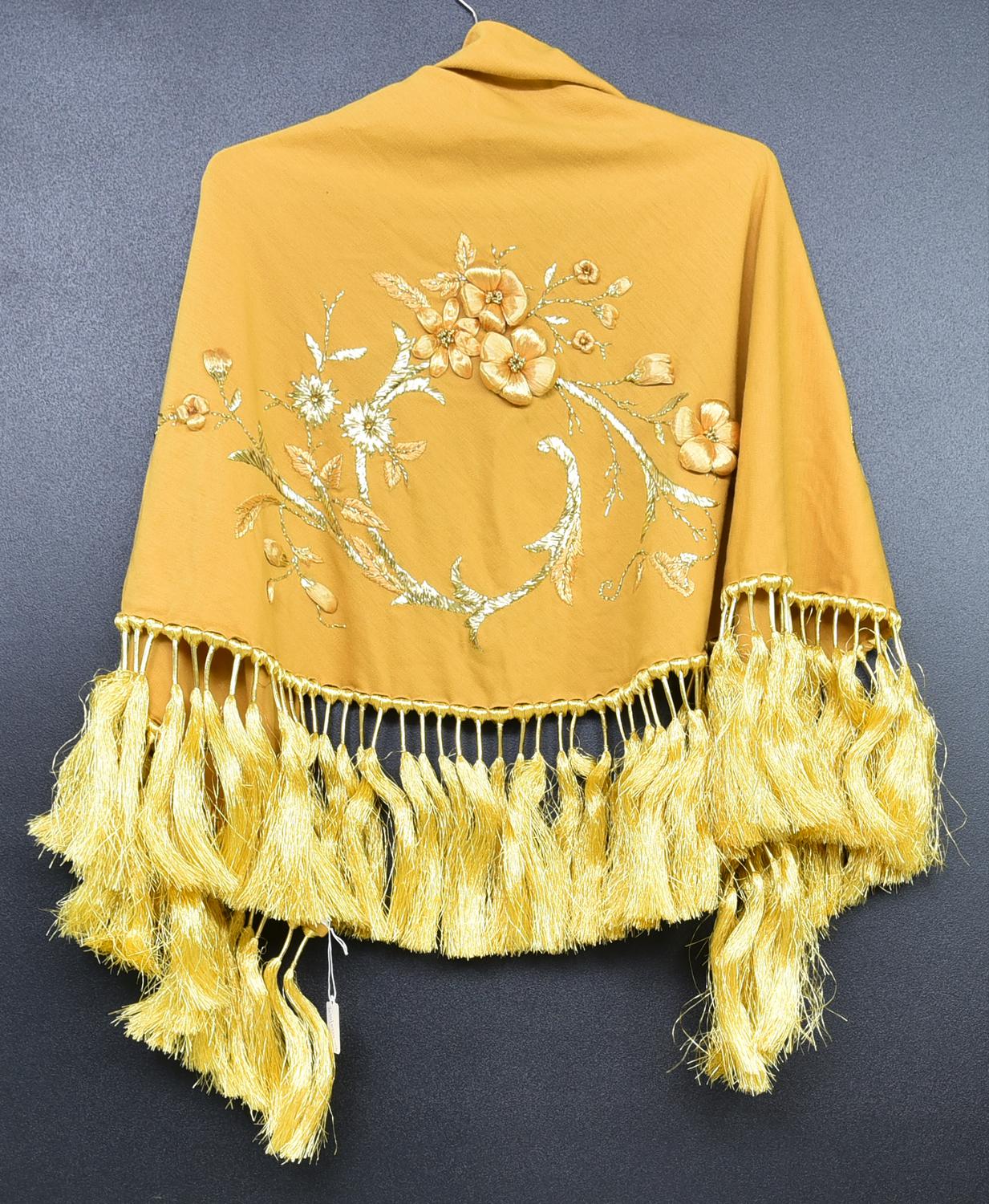 GOLD FLORAL SHAWL DESCRIPTION: Gold shawl with floral decorations. Perfectly...