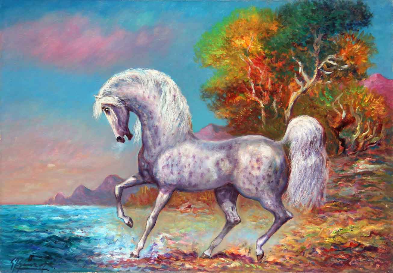 Giovan Francesco GONZAGA Milano 1921-2007 Corsiero sulla riva del mare, 1971 olio su tela / oil on canvas cm. 50x70 Autentica dell’artista su fotografia, con timbro dell’Archivio fotografico generale di Giovan Francesco Gonzaga, a cura della galleria Il salotto, Milano, con n° AAC3271 Certificate issued by the artist, with stamp of Archivio fotografico generale di Giovan Francesco Gonzaga, by gallery Il salotto, Milan, under no. AAC3271 Firma ‘G.F. Gonzaga’ (in basso a sinistra) Luogo, firma, data, titolo, scritta ‘Nello studio di Milano, G.F. Gonzaga, 1971, Corsiero sulla riva del mare, dipinto autentico G.F. Gonzaga’; timbro dell’Archivio fotografico generale di Giovan Francesco Gonzaga; timbro di Arte-idea, Milano (al retro)