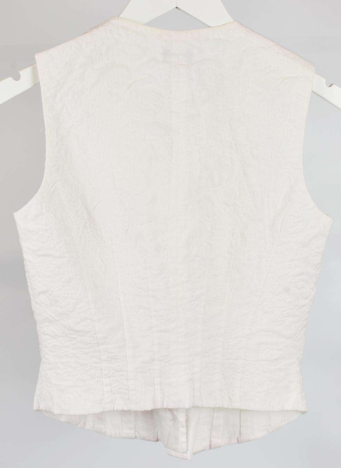 Top smanicato bianco ricamato tono su tono. Taglia 36. Prodotto in Francia. Presenta aloni e qualche segno d’uso. Ben conservato.