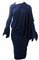 stretch crepe jersey for this cocktail dress in dark blue colour. Gathered collar and cuff for an asymmetrical and draped body sustained by a tight band skirt on the lower part to emphasize even more all the volume. Raw edges for hem collar and sleeves. Made in England in the early 90s. Size Uk 10. Perfectly preserved.