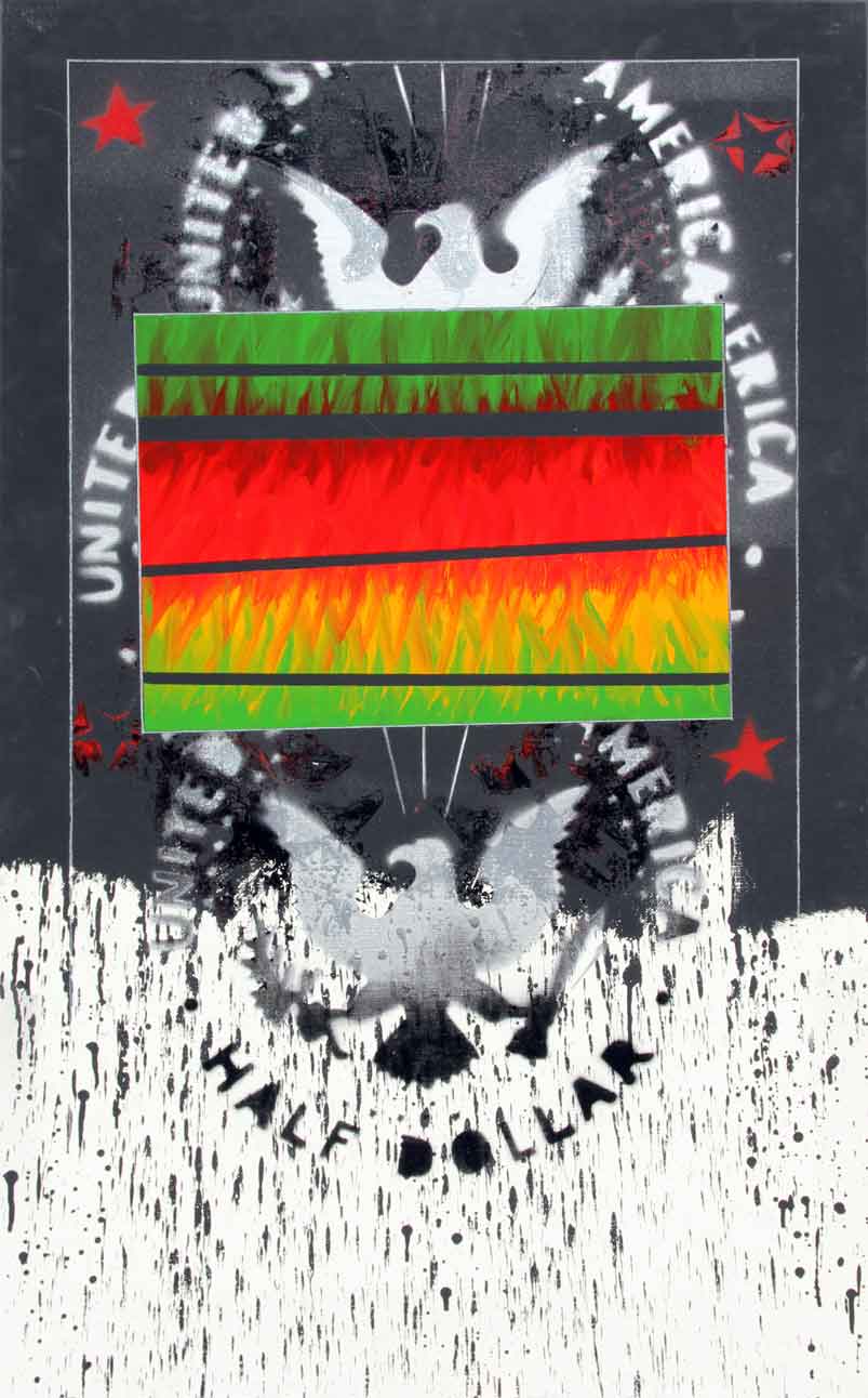 Franco ANGELI Roma 1935-1988 R Italiano, 1984 smalto su tela / enamel on canvas cm. 100x60 Autentica dell’Archivio per la Monografia ‘Franco Angeli 10 mercanti un artista’, a cura di F. Gallo, con firma di A. Calestani, con n° P.P.2304 Certificate of the ‘Archivio per la Monografia ‘Franco Angeli 10 mercanti un artista’, by F. Gallo, signed by A. Calestani, under no. P.P.2304 Firma, titolo ‘Franco Angeli, R Italiano’ (al retro) Signed, titled ‘Franco Angeli, R Italiano’ (on the reverse)
