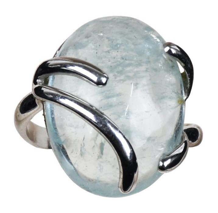 particolare anello in oro bianco, con al centro splendido berillo azzurro taglio cabochon