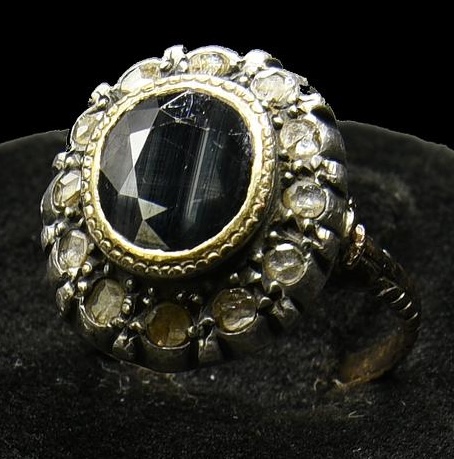 ANELLO IN ORO A BASSO TITOLO, ARGENTO, DIAMANTI E ZAFFIRO anello a corolla...