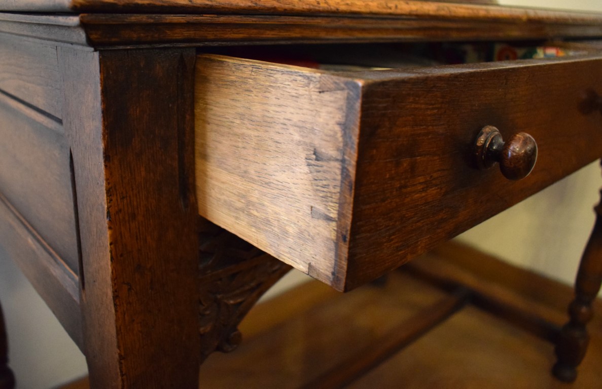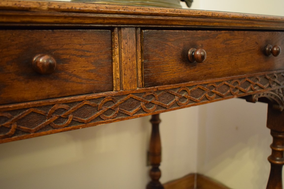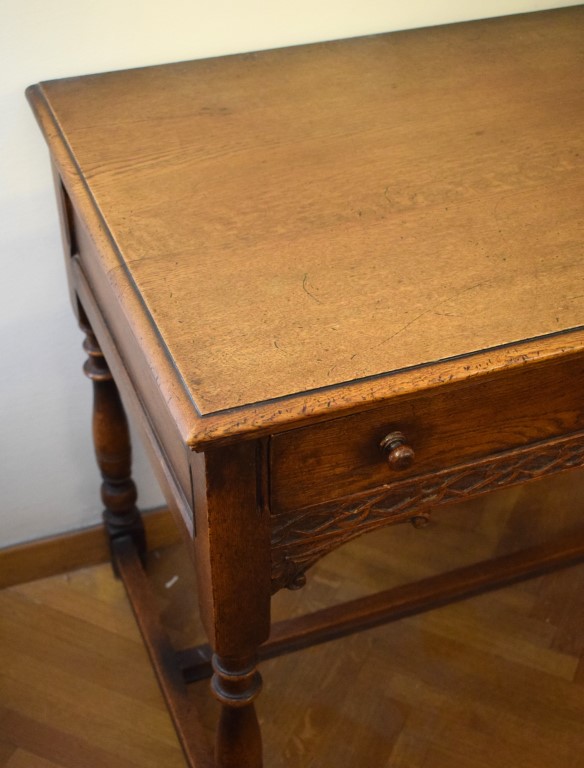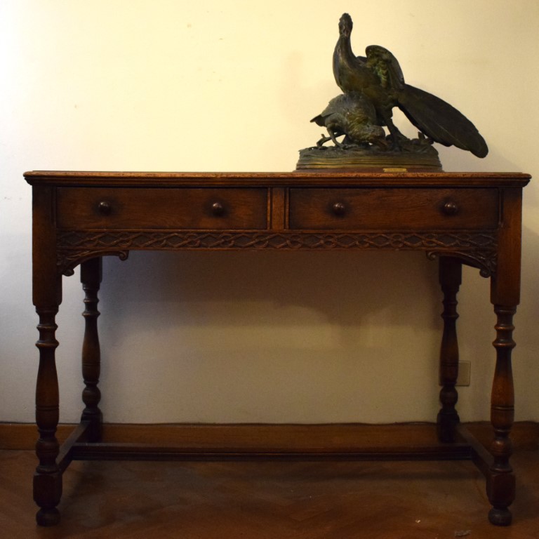 piano con profilo a becco di civetta, due cassetti nella fascia, gambe tornite
