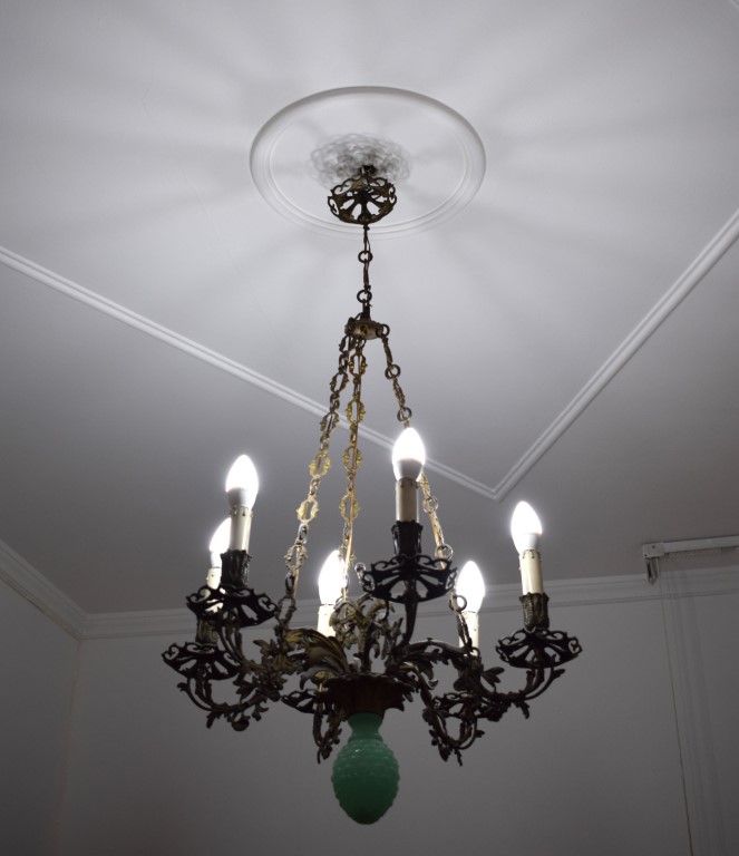 Lotto 93 | Lampadario in bronzo brunito vetro lattimo verde a sei luci H cm 97 D cm 54...