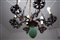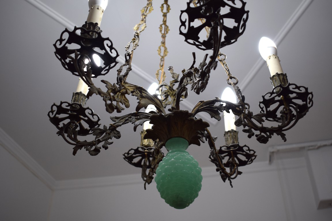 Lampadario in bronzo brunito vetro lattimo verde a sei luci H cm 97 D cm 54...
