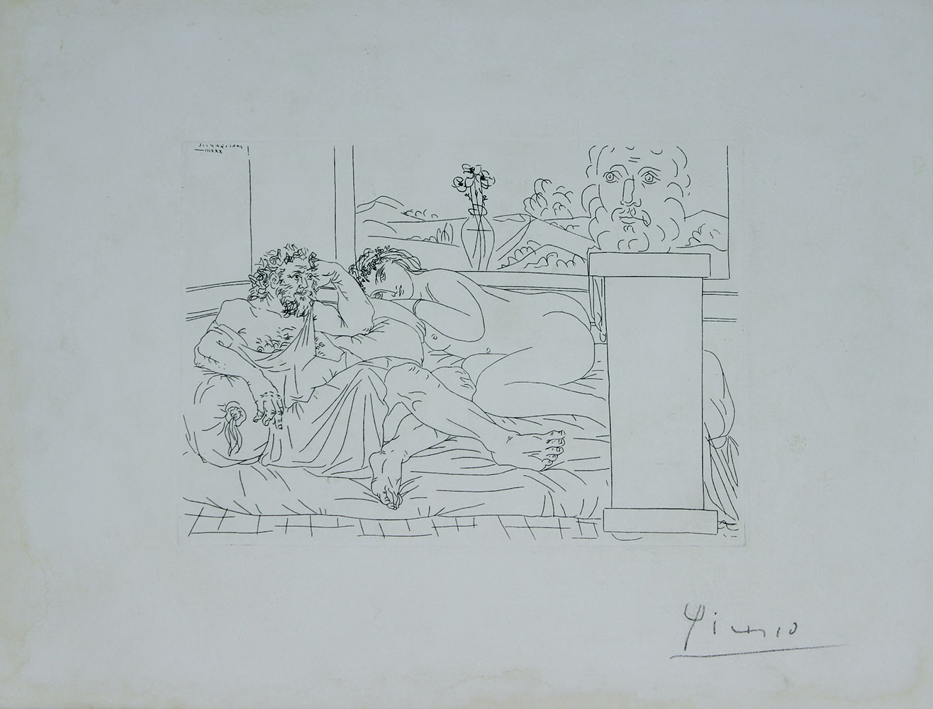 Picasso Pablo Senza titolo acquaforte su carta, cm. 34,5x45 (lastra cm.19,5x26,5) firmata in basso a destra, opera pubblicata su G. Bloch, "Pablo Picasso Catalogue de l'ouvre gravé et lithographié 1904-1967", Editions Kornfeld et Klipstein, Berne, 1968
