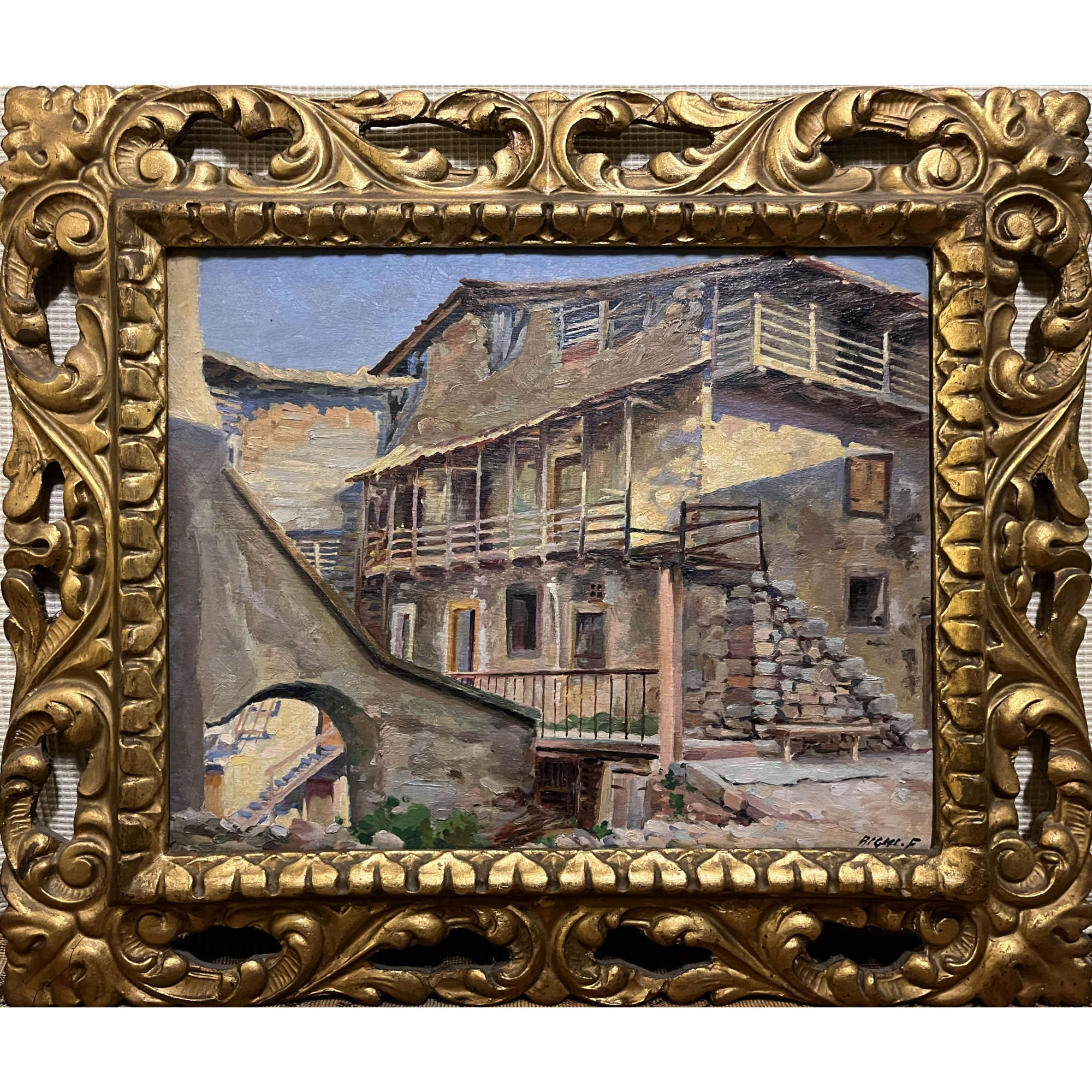 Fernando Righi, Rustici, olio su cartone,cm 22x28, in cornice dorata, firmato in basso a dx.